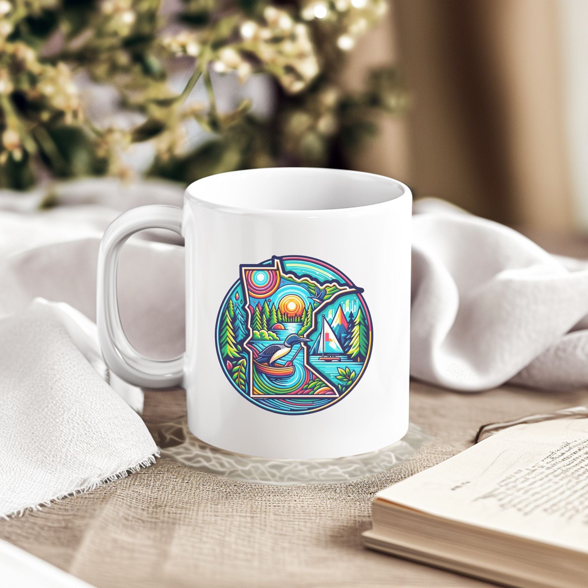 Embrace the beauty of Minnesota with our Vibrant Circle Mug! Featuring a stunning loon surrounded by picturesque lakes, mountains, trees, and sun, this mug will transport you to the great outdoors with every sip. Experience the vibrant sights of this beloved state in the comfort of your own home.