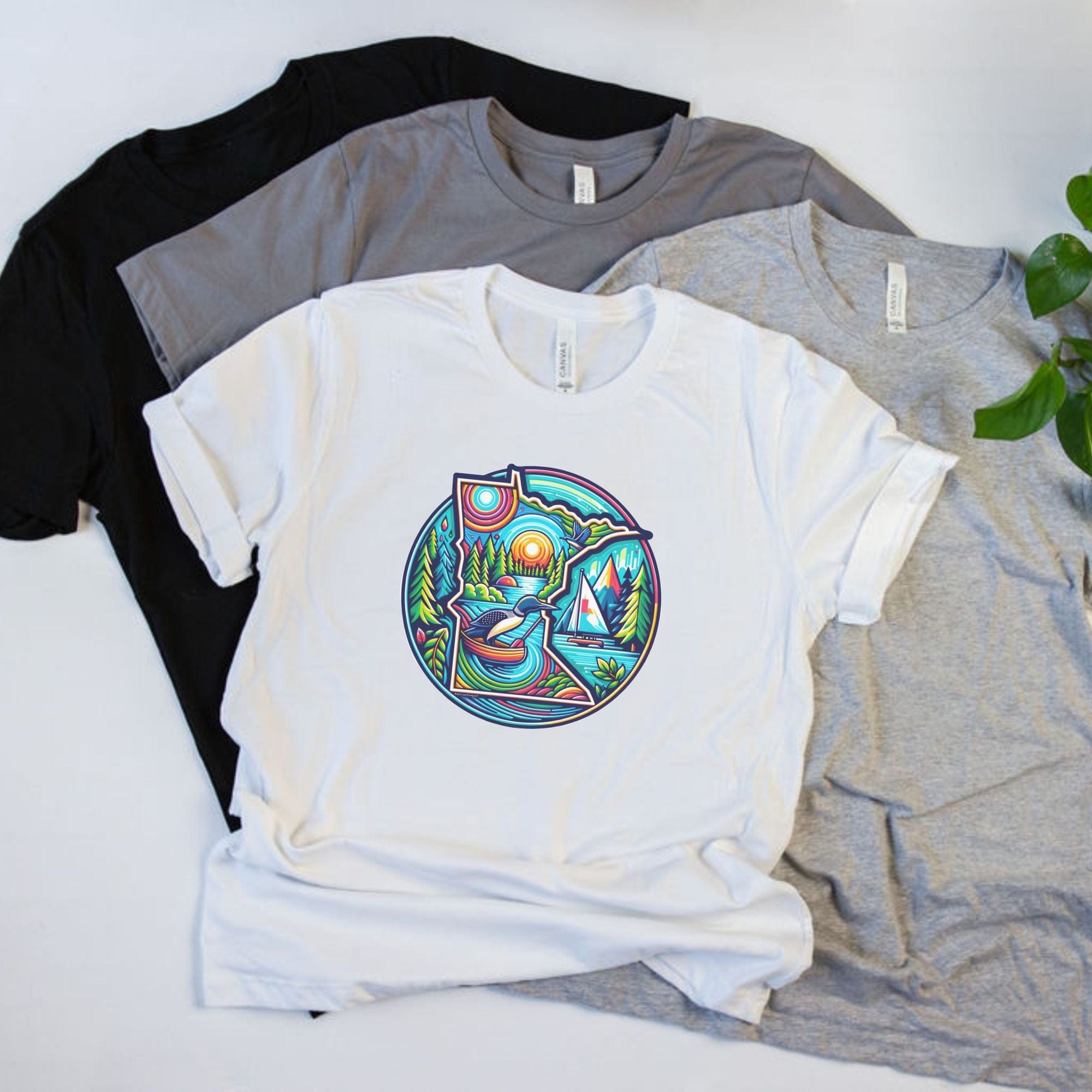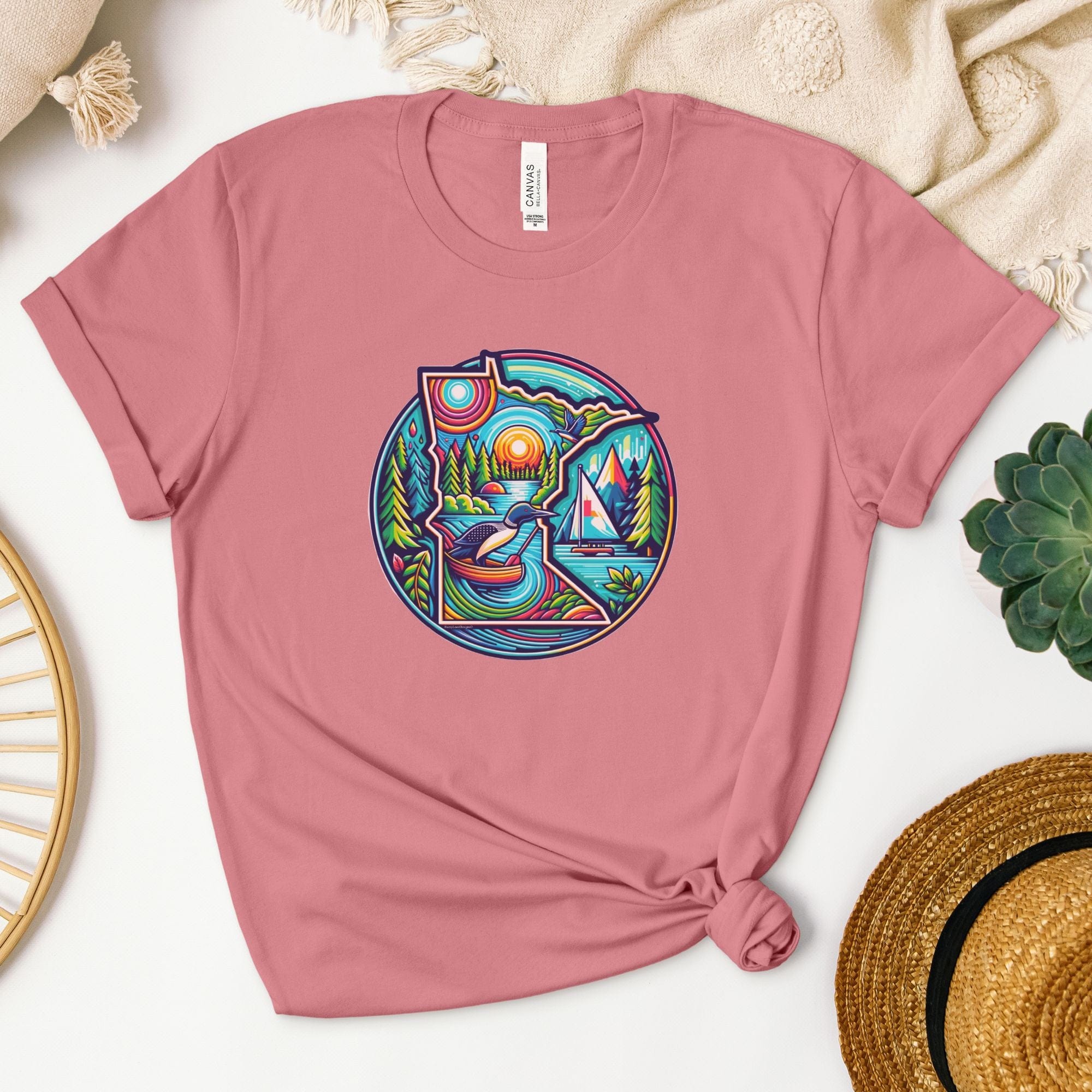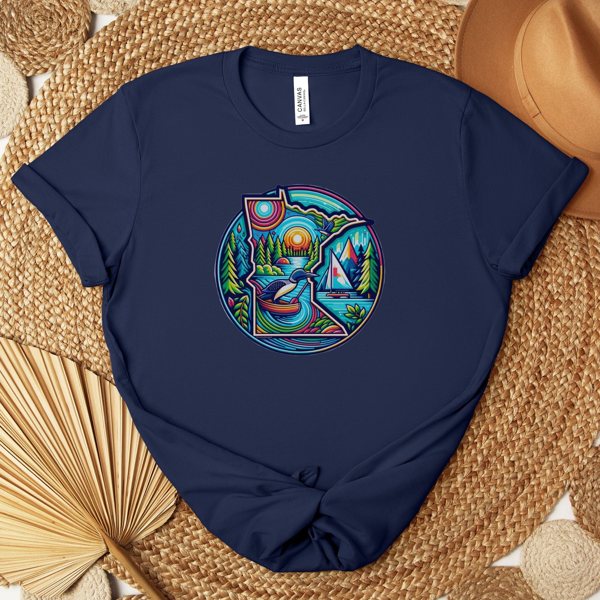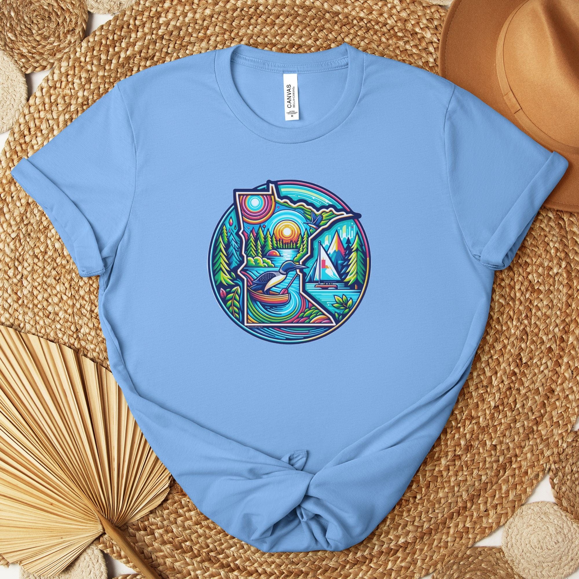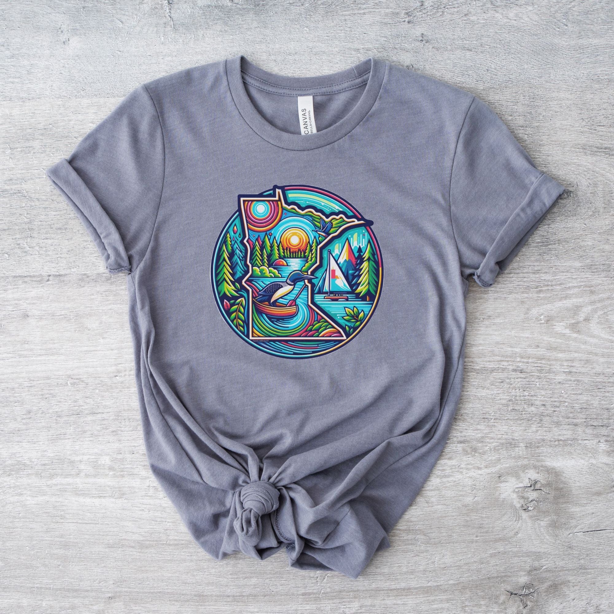 Add some color to your wardrobe with our Vibrant Minnesota Circle T-Shirt. Featuring a striking outline of Minnesota, along with iconic images of a loon, canoe, sailboat, trees, and sunset, this shirt is perfect for showcasing your love for the North Star State. Stand out in style and embrace the beauty of Minnesota.