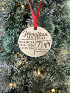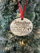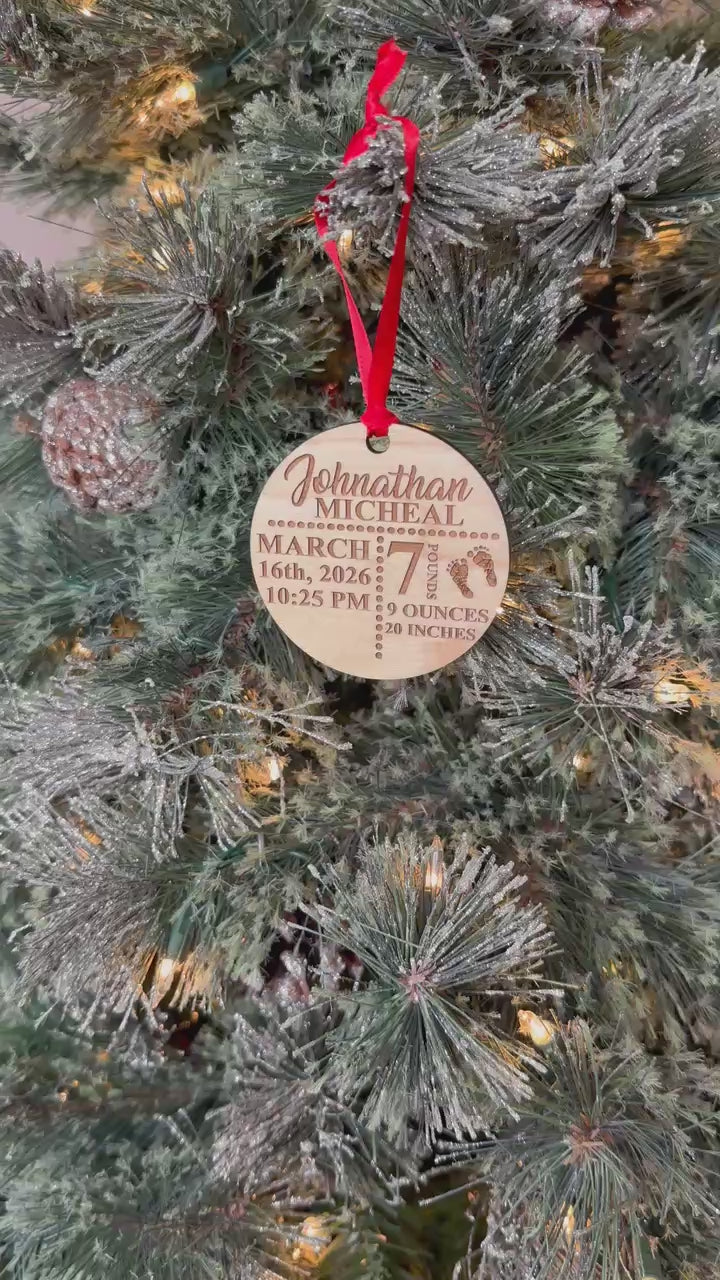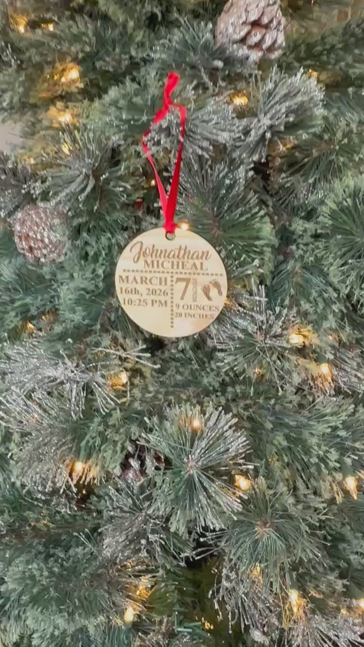 This elegant personalized wood ornament is a 3 inch round. It is cut from 3mm birch wood. Please leave FIRST and MIDDLE name in the personalization section as well as ALL birth information (Date, Time, Weight, Height) in the notes section.