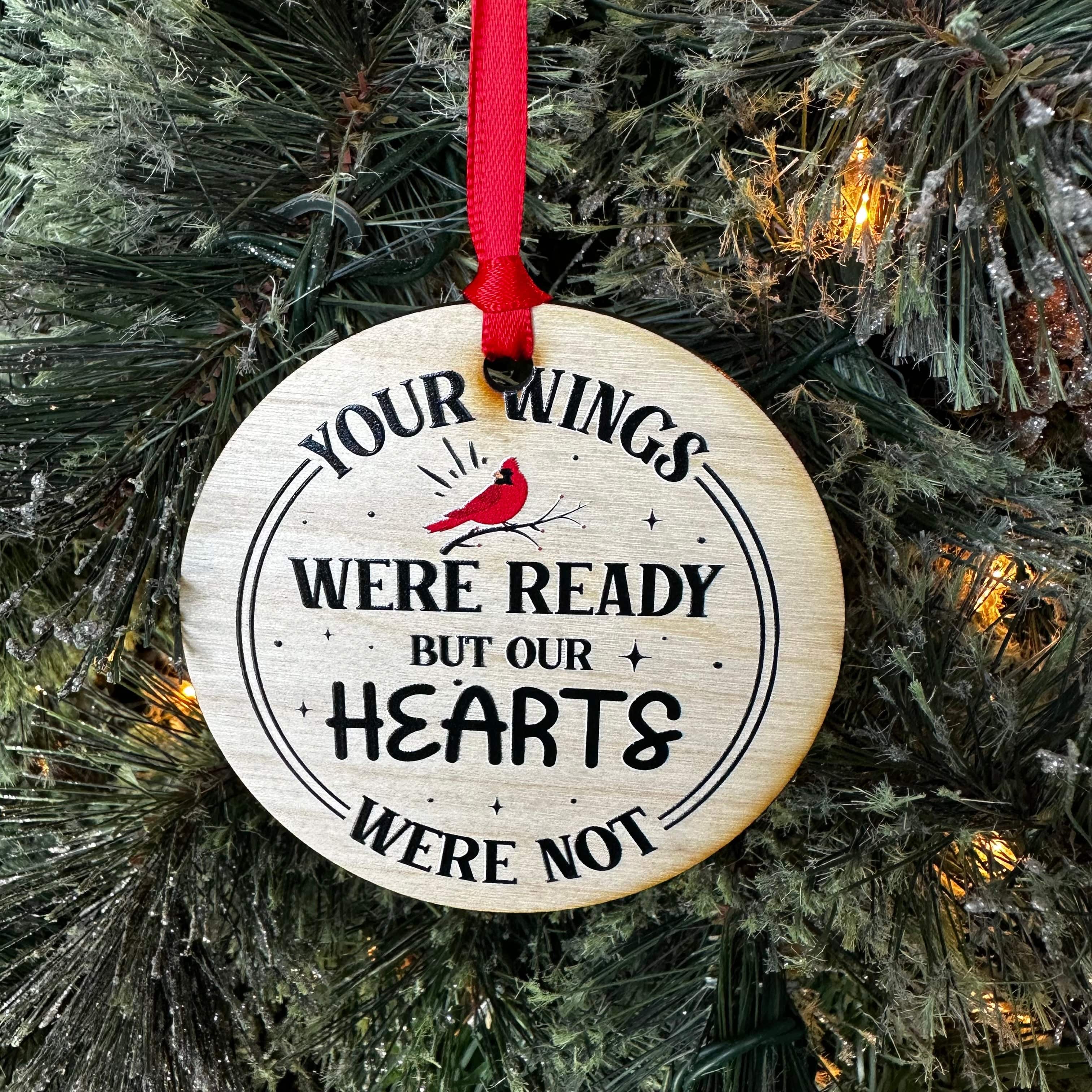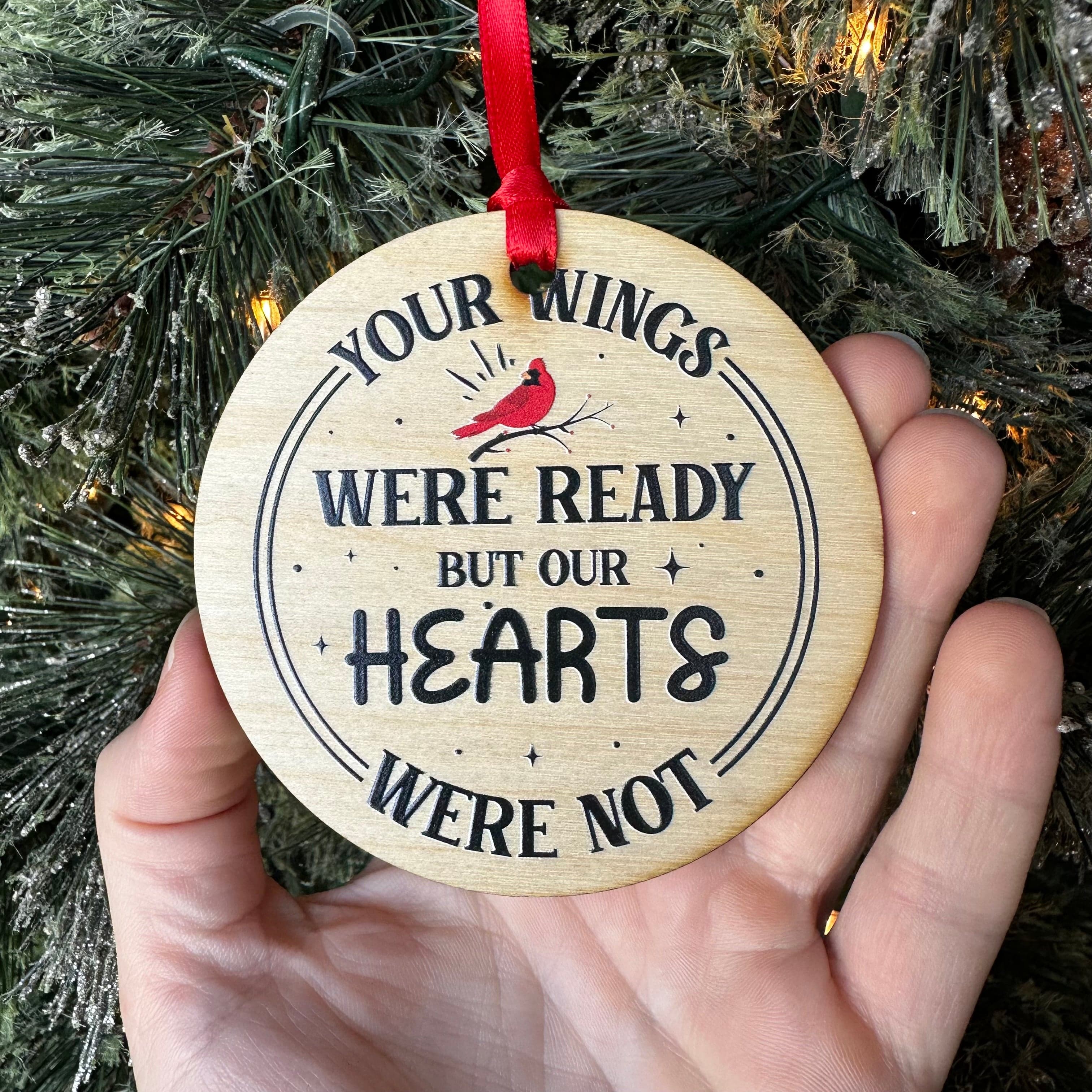 Keep the memory of your loved ones close this holiday season with our "Your Wings Were Ready" wood ornament. A touching reminder of those who have passed, this ornament adds a special touch to your tree. Honor their memory with this sentimental addition to your holiday decorations.