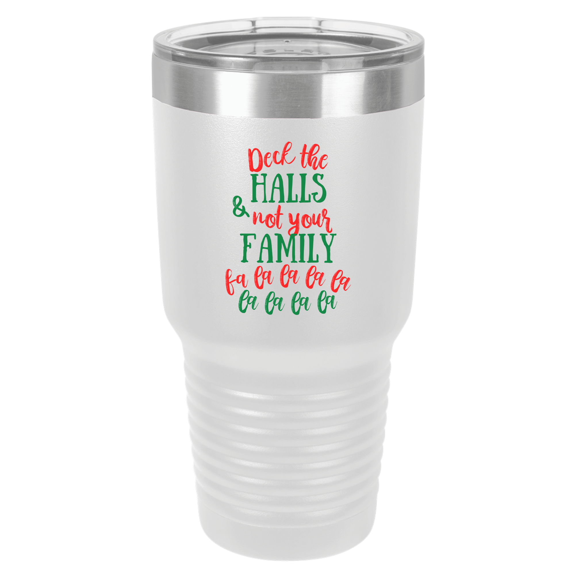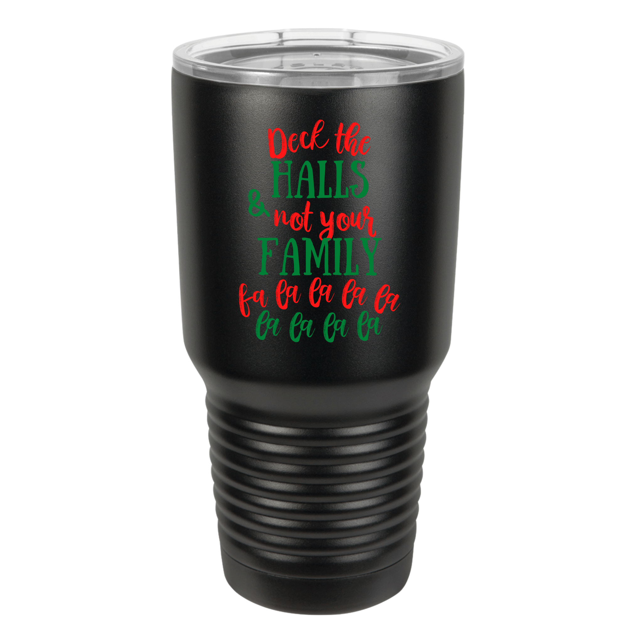 Design reads, "Deck the halls and not your family, fa la la la la, la la la la" in red and green font.