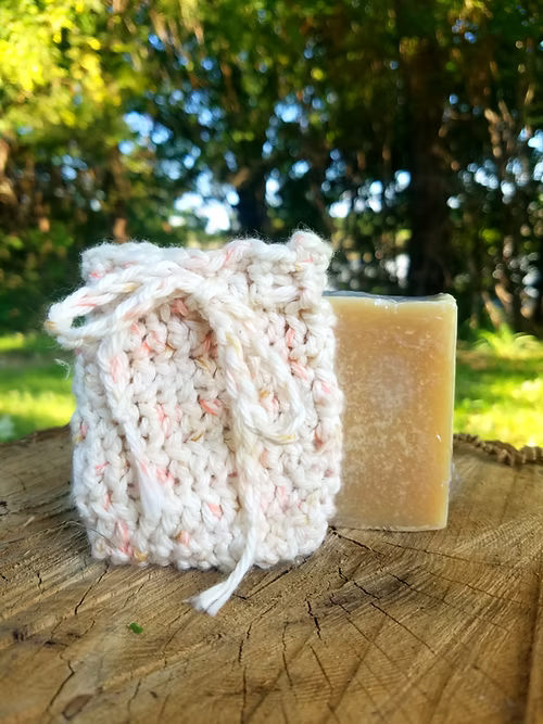 This little homemade, crocheted, 100% cotton bag is called a soap saver. Simply put your whole Twisted Oaks Farm goat milk bar soap inside the bag or add all the tiny bits of left over soap inside before you tie it off. Set it inside your shower and rub the soap saver bag onto your body like a washcloth. The tie helps you hang dry your soap after every use. Soap Saver Bags are machine washable, but be mindful that drying at high temps may shrink the Soap Saver.