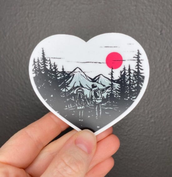 This beautiful sticker is an image of couple hiking in the mountains, outlined by a heart. 3 x 2.75” .