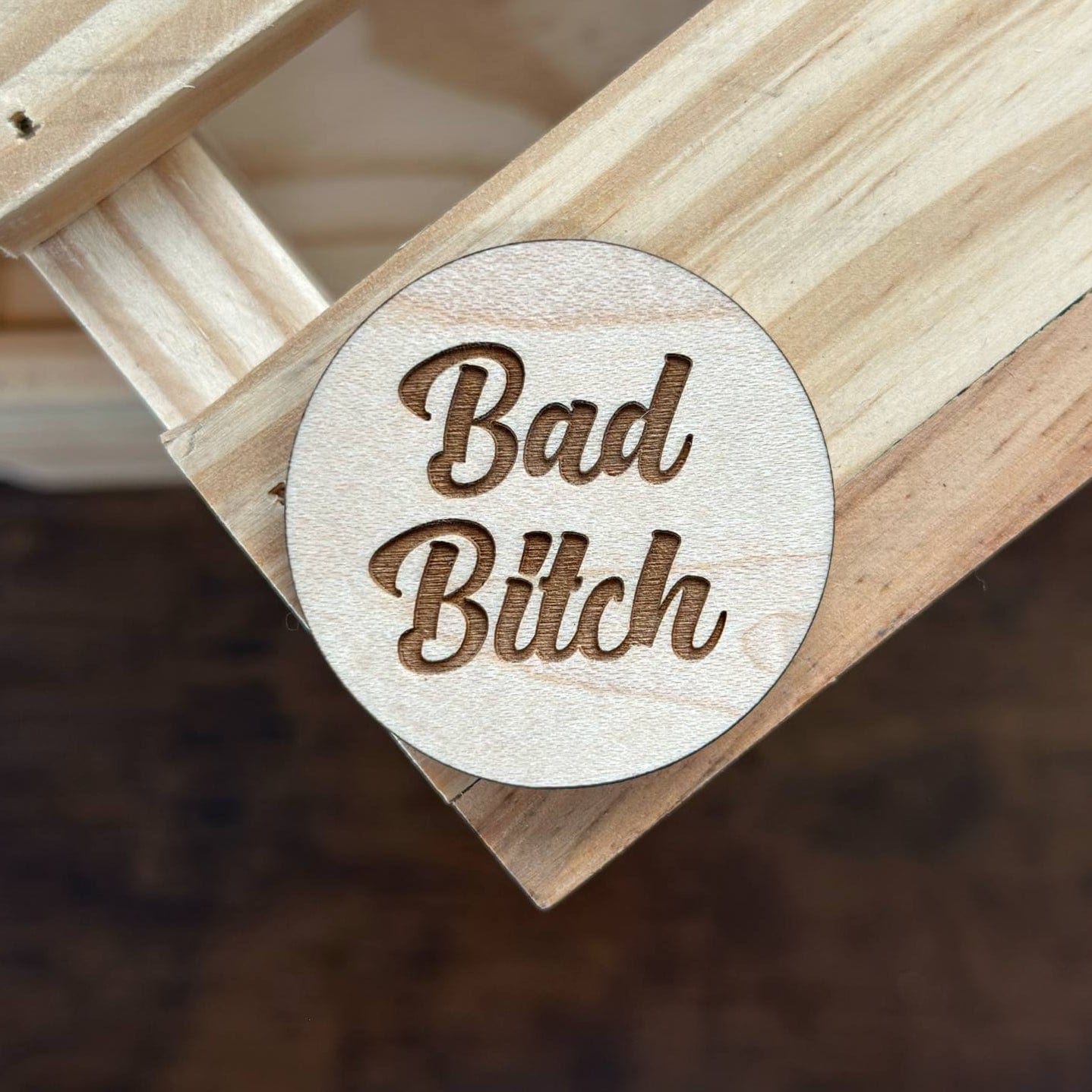 Embrace your fierce side with this sassy wood magnet! Boldly engraved with "Bad Bitch," this compact 1.5" round accessory adds attitude to any magnetic surface. Perfect for your fridge, locker, or office space. A fun gift for the empowered individuals in your life!