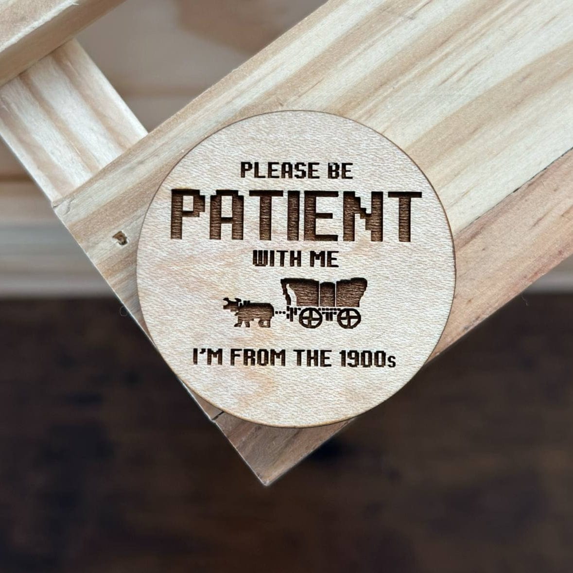 Charm everyone with our "Be Patient With Me I'm from the 1900's" wood magnet. This delightful 1.5" round keepsake features an amusing covered wagon image alongside the humorous message, all beautifully engraved. The perfect conversation starter for your refrigerator or office space that's sure to spark smiles and nostalgia.