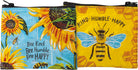 Made of post-consumer material, this double-sided zipper wallet lends a front "Bee Kind Bee Humble Bee Happy" sentiment with peppy sunflower and bee designs, reverse "Kind Humble Happy" sentiment with bee illustration, and a top zip closure. Complements well with other pieces in collection to create a vibrant display!