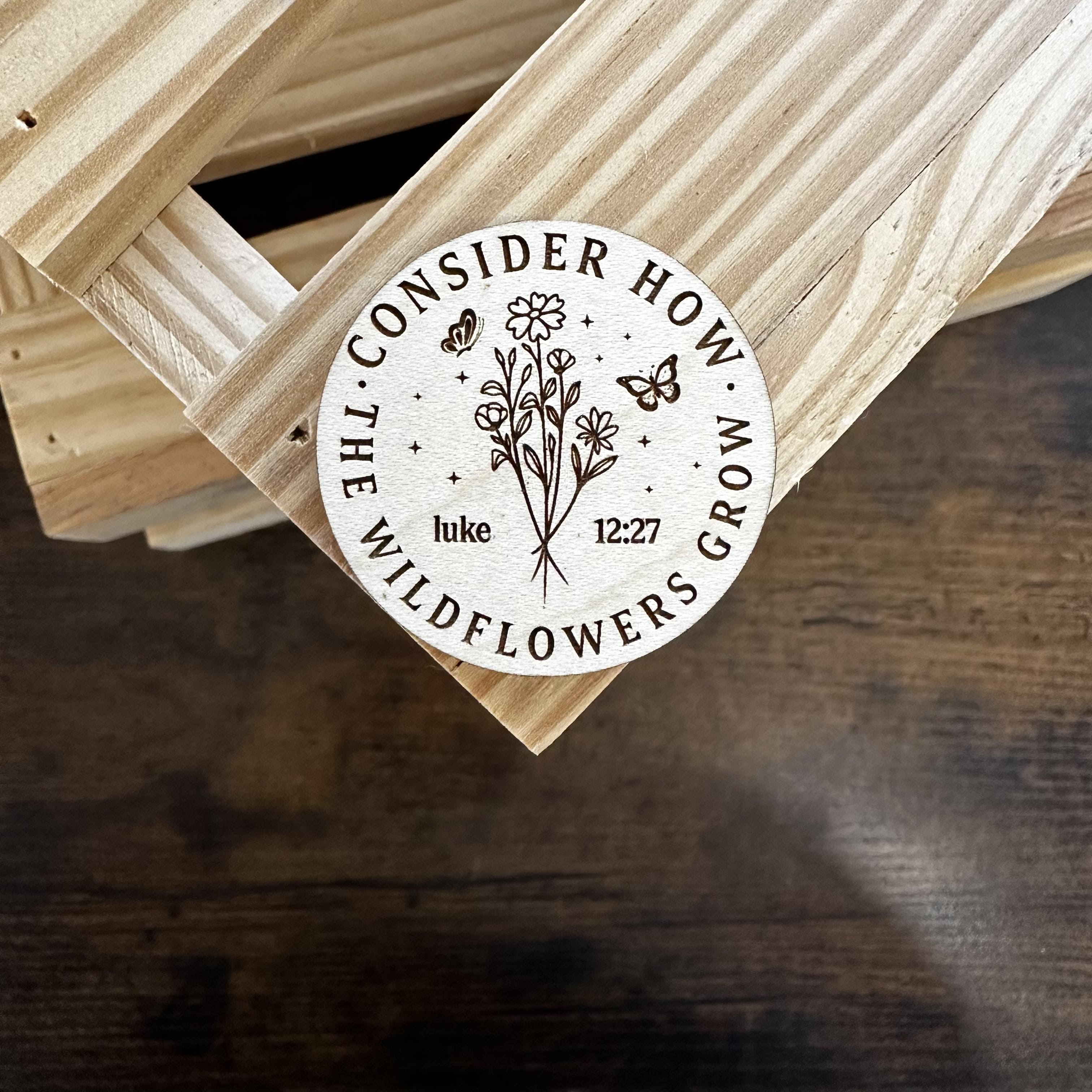 Bring a touch of nature into your home with our "Consider How the Wildflowers Grow" wood magnet, featuring the inspiring words from Luke 12:27. Let the beauty of wildflowers remind you to embrace the present moment and trust in God's plan. A perfect addition to any magnetic surface.