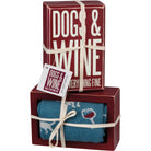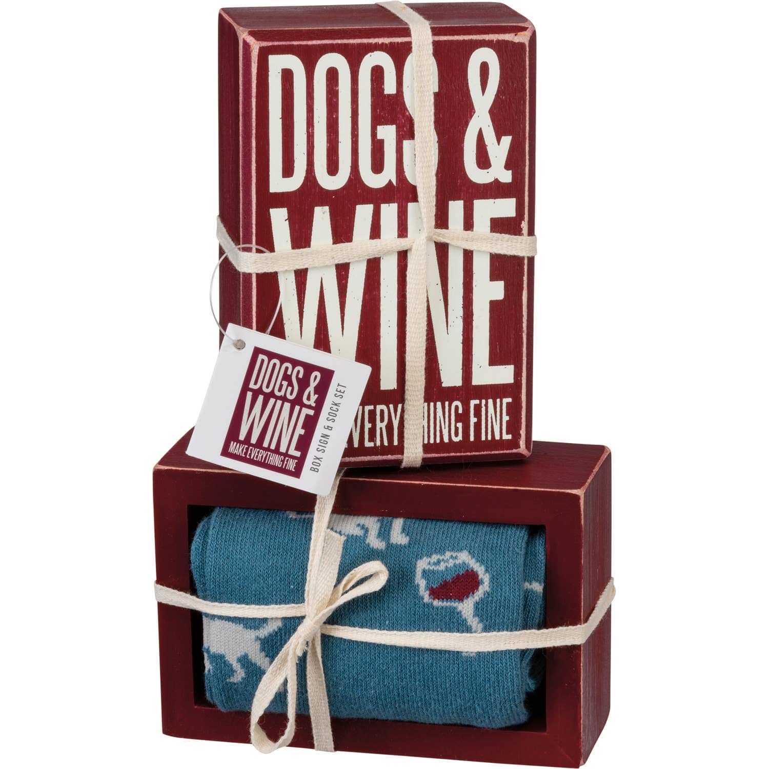 Unleash the perfect gift with this set, complete with a box sign featuring the charming sentiment "Dogs & Wine Make Everything Fine" and a pair of socks adorned with playful designs of dogs and wine glasses. The socks, made with a blend of cotton, nylon, and spandex, are conveniently machine-washable and fit most sizes. The box sign is easily hung or can stand on its own, and the socks come neatly rolled inside with a cute cotton tape ribbon to keep them in place. Cheers to a paws-itively delightful present!