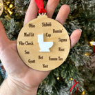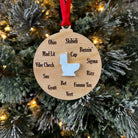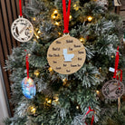 Our ornaments come with a red ribbon for easy hanging and are perfect for decorating Christmas trees, gifting, or adding a personalized touch to your holiday collection. Due to the nature of the wood and laser cutting process, some ornaments may display slight char marks along the edges and back, enhancing the natural, rustic look.