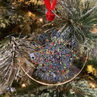 Celebrate with this beautiful 3.5" round clear acrylic ornament. Comes with a red ribbon attached.