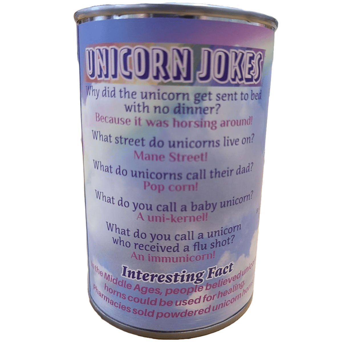 Plush unicorn sealed in a soup can. Use a can opener to open the fun gift. • Plush measures approx. 5 inches. • Funny unicorn jokes and an interesting fact on the can. • Designed and canned in the USA. Can and label made in USA. Unicorn made in China.