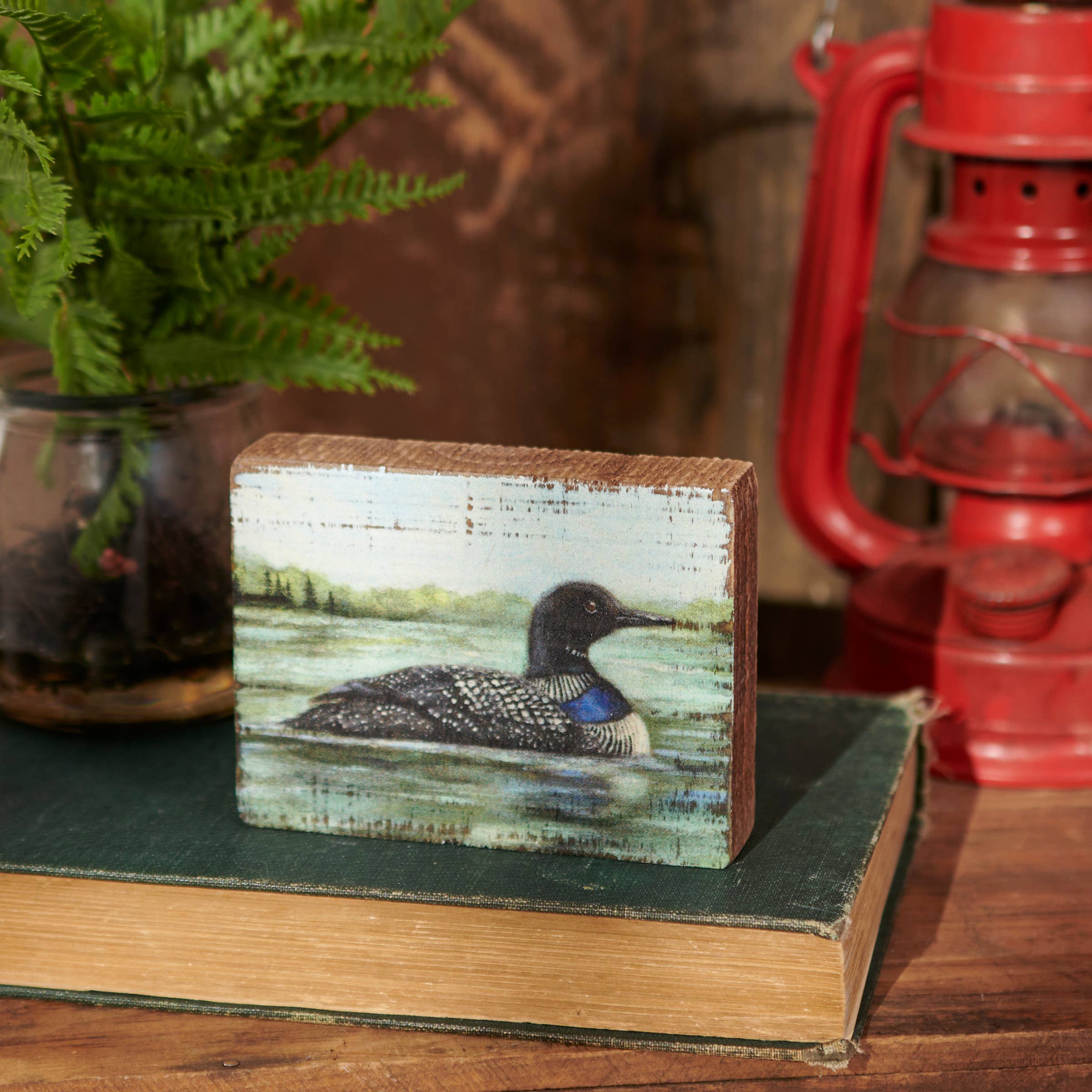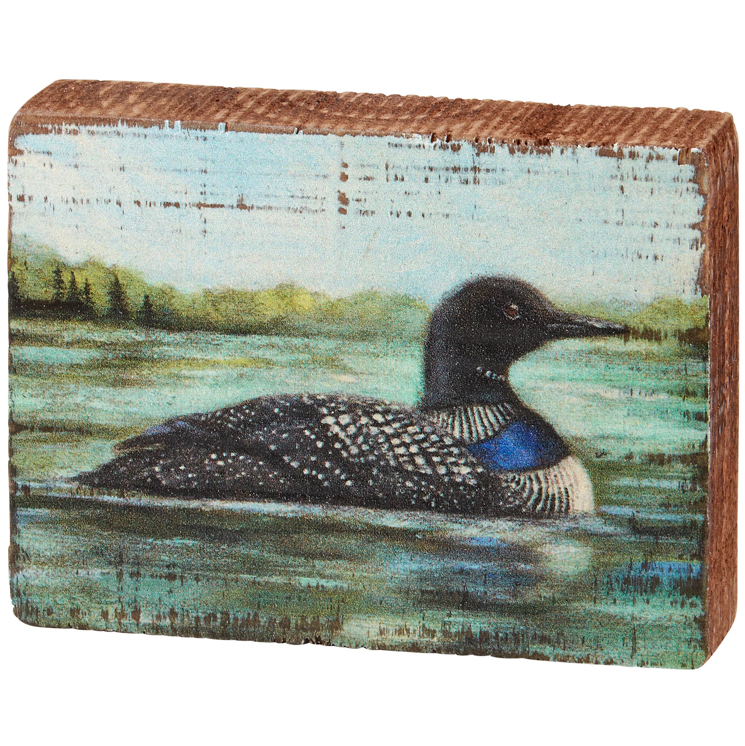 A wooden block sign from our Lake & Cabin Collection displaying a calming scene of a loon in a lake. Design is replicated from original artwork painted onto burlap canvas, giving the art a unique depth and texture. Block sign features distressed details with coordinating natural wood on the sides and back. Our Loon block sign is easy to hang via predrilled keyhole slot or can free-stand alone. A rustic everyday home accent with a variety of display options.