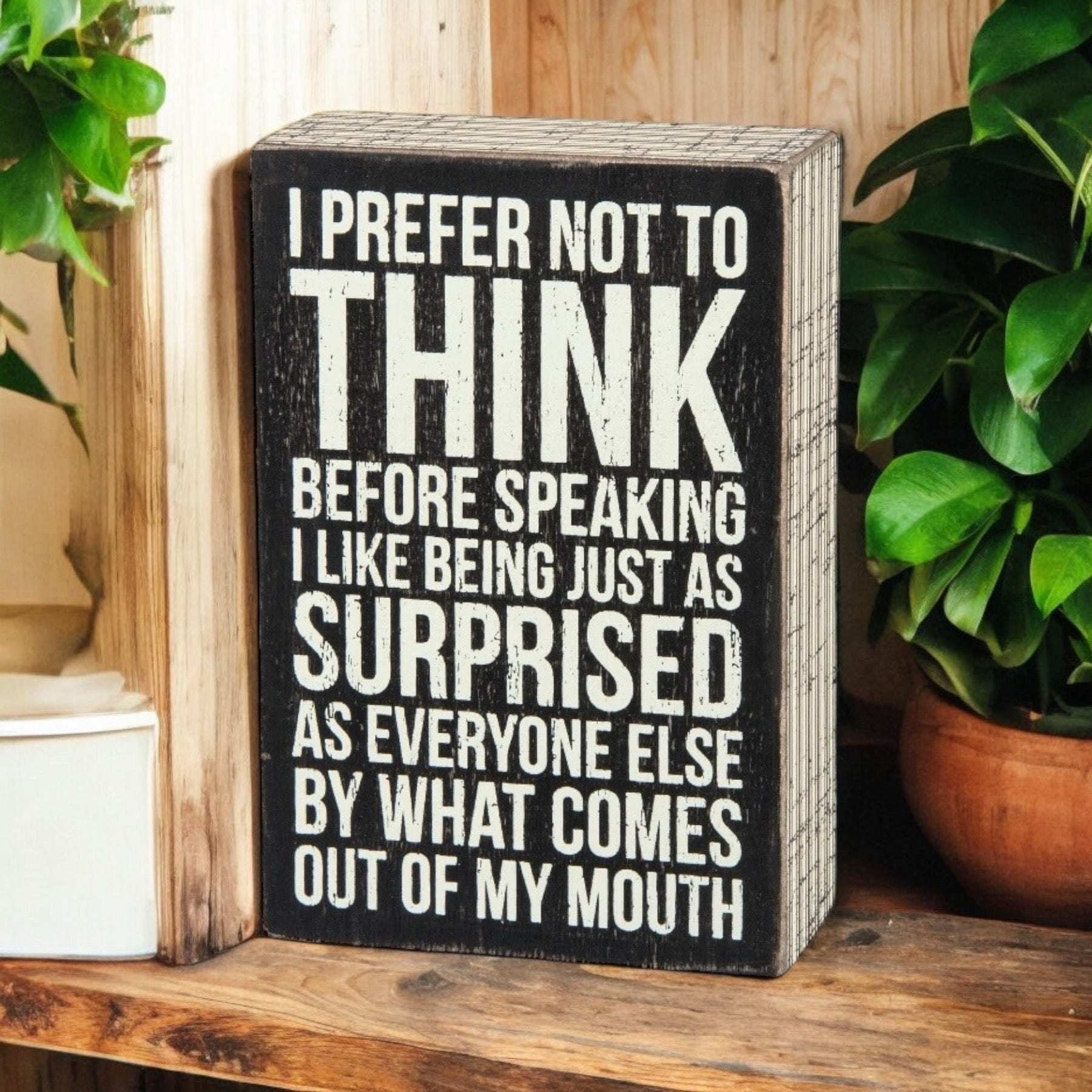 A classic black and white wooden box sign featuring a distressed "I Prefer Not To Think Before Speaking - I Like Being Just As Surprised As Everyone Else By What Comes Out Of My Mouth" sentiment with striped trim designs. Easy to hang or can free-stand alone.