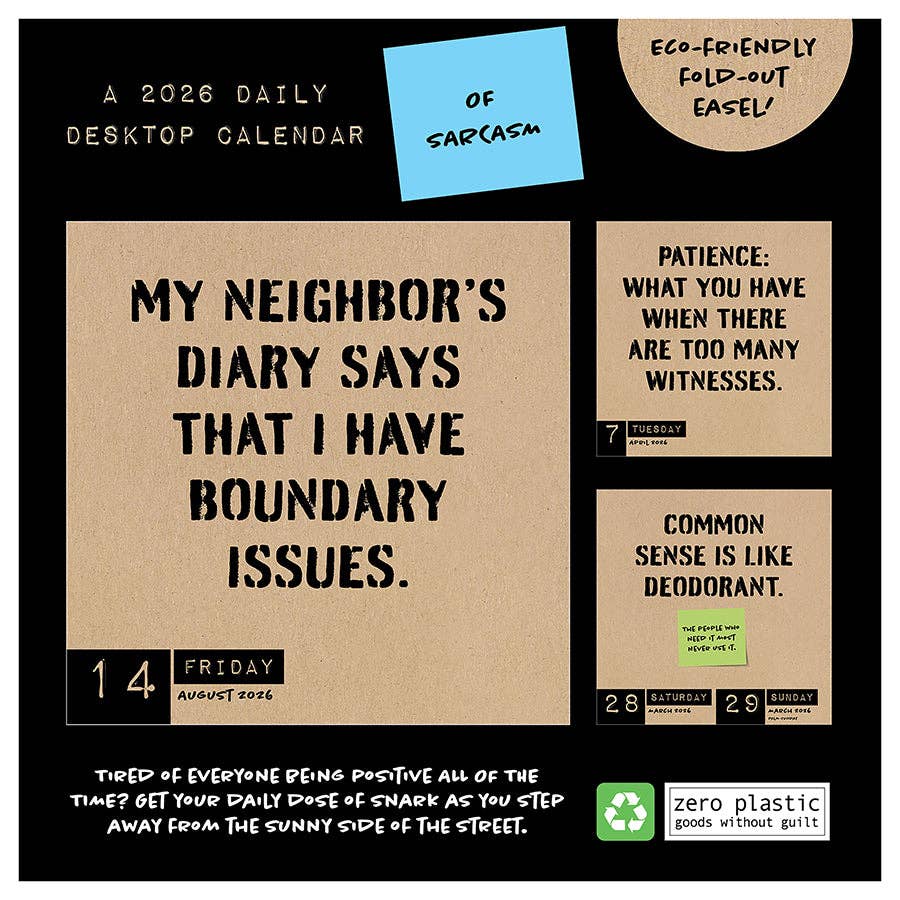 Tired of nonstop positivity? Get your daily dose of snark with this hilarious anti-affirmations desk calendar. The 2026 daily desk calendar (January–December 2026) measures 5.25" x 5.25" and features a foldout easel for easy desk display. Daily tear-off pages (weekends combined) showcase anti-affirmations on the front, with lined space for notes on the back. Packaged in a wraparound cover, this calendar is plastic-free and printed on FSC-certified paper.