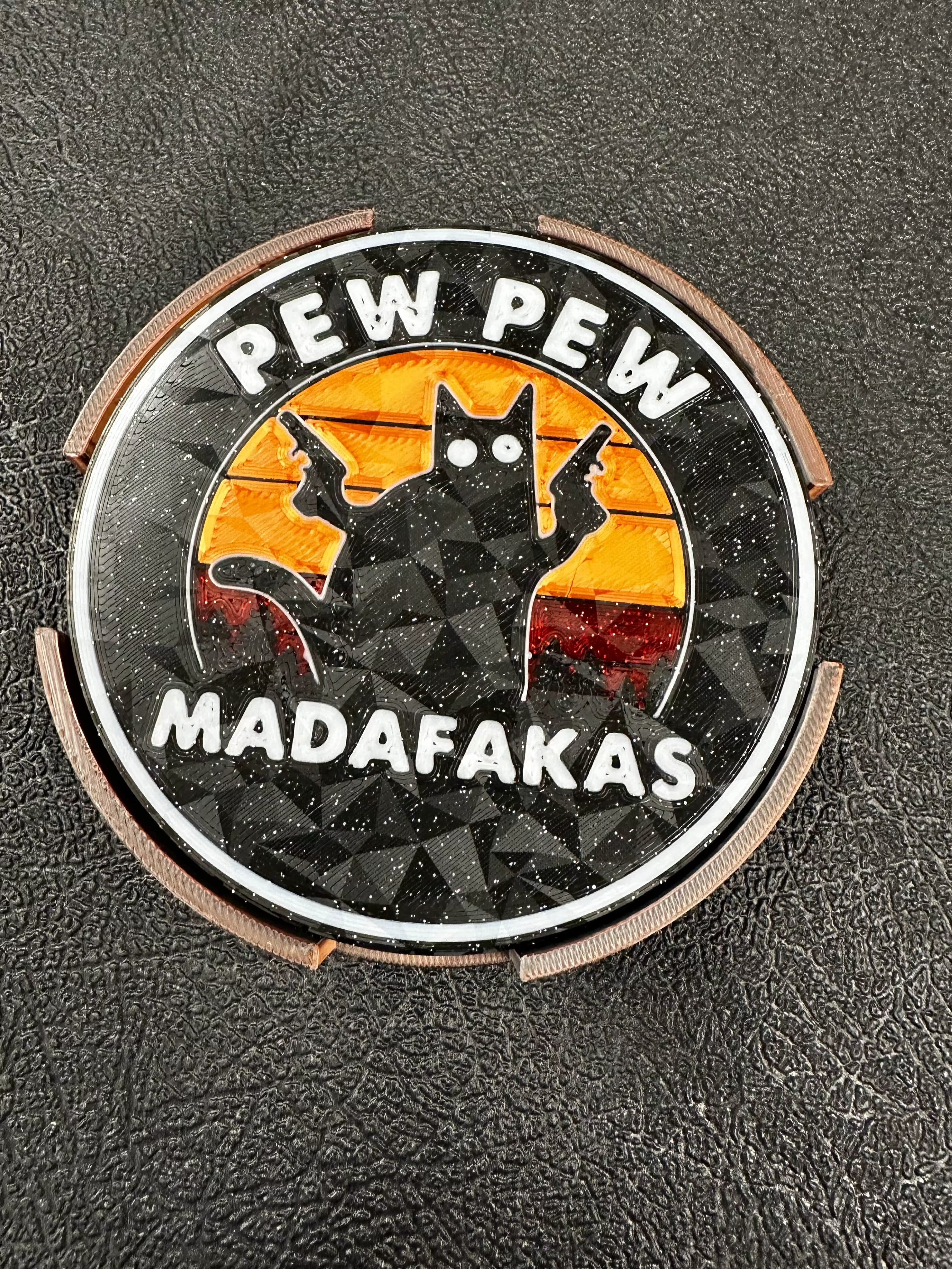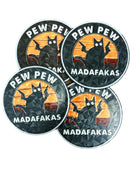 The fun image is of a cat holding two handguns and the phrase "Pew Pew Madafakas"