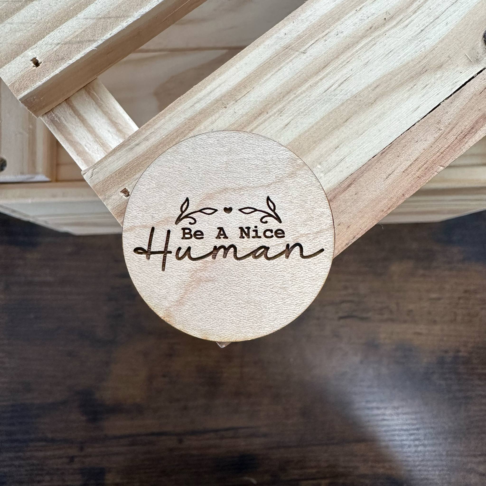 Spread kindness with this charming wood-engraved magnet featuring a simple yet powerful reminder: "Be a Nice Human." Perfectly sized at 1.5" round, this thoughtful piece adds character to any magnetic surface while promoting positivity. An ideal gift for friends, coworkers, or yourself, because sometimes we all need a gentle reminder of what truly matters.