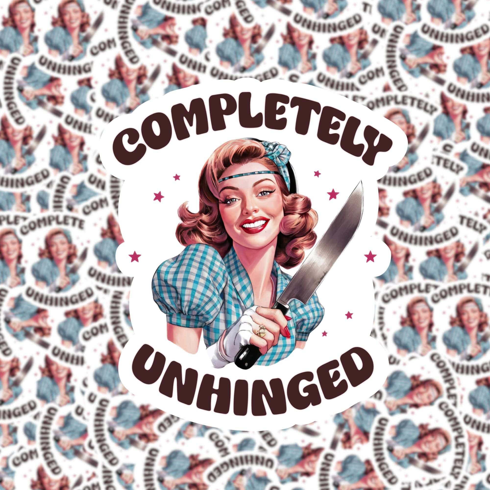 Add a touch of insanity to your life with our Completely Unhinged sticker! Featuring a cheeky pinup girl holding a knife, this sticker is the perfect blend of quirky and funny. Stick it anywhere for a unique and playful touch.
