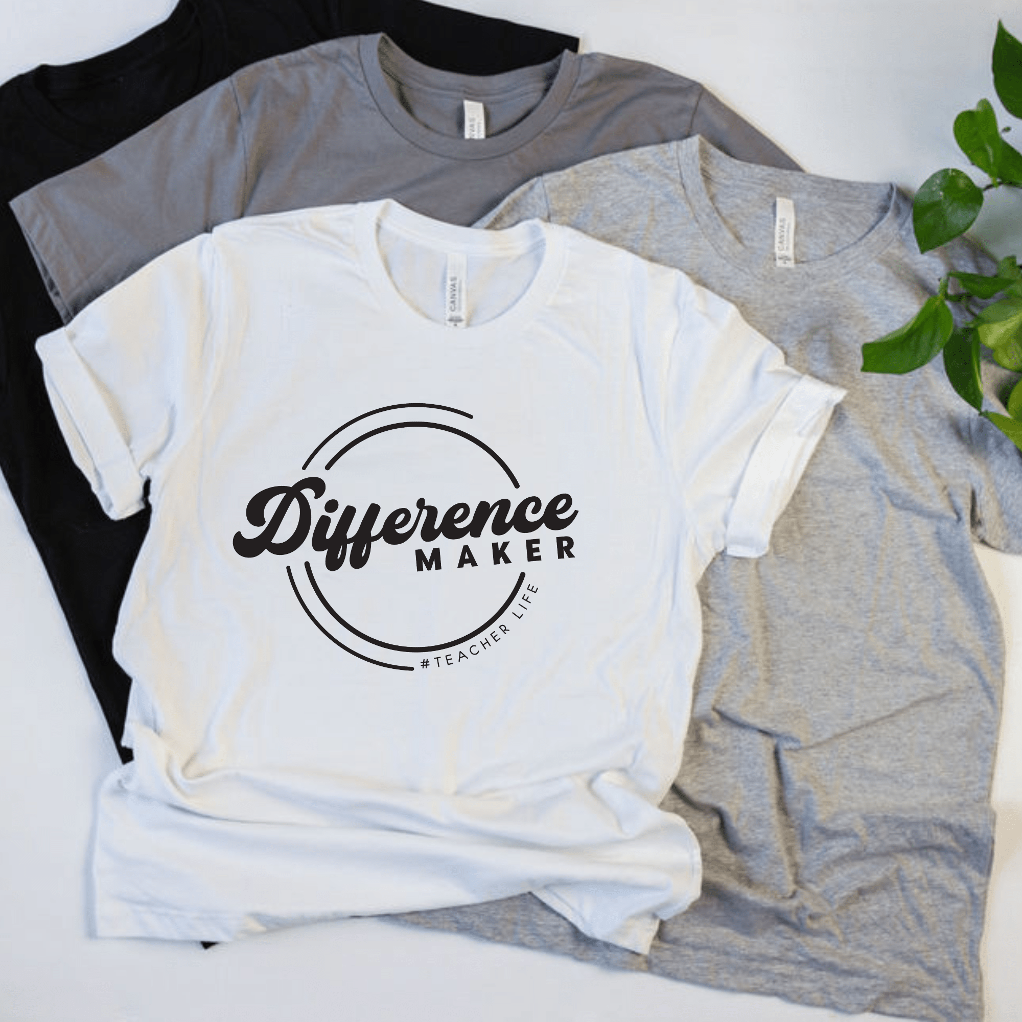 This Difference Maker Teacher T-Shirt is the perfect way to recognize the impact educators have on their students' lives. With a bold and inspirational message, this tee is sure to brighten any teacher's day. Made from soft and comfortable fabric, show appreciation for hard-working teachers everywhere.