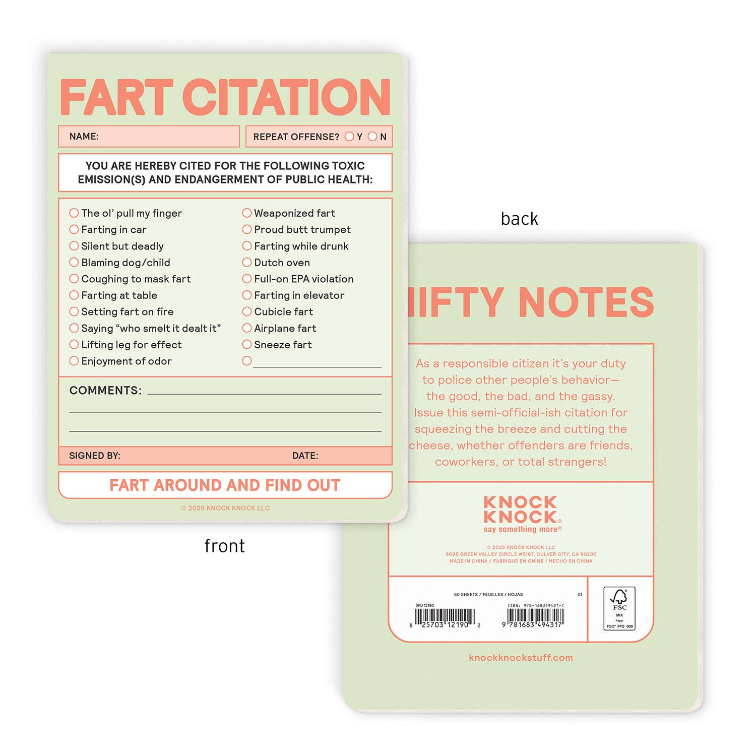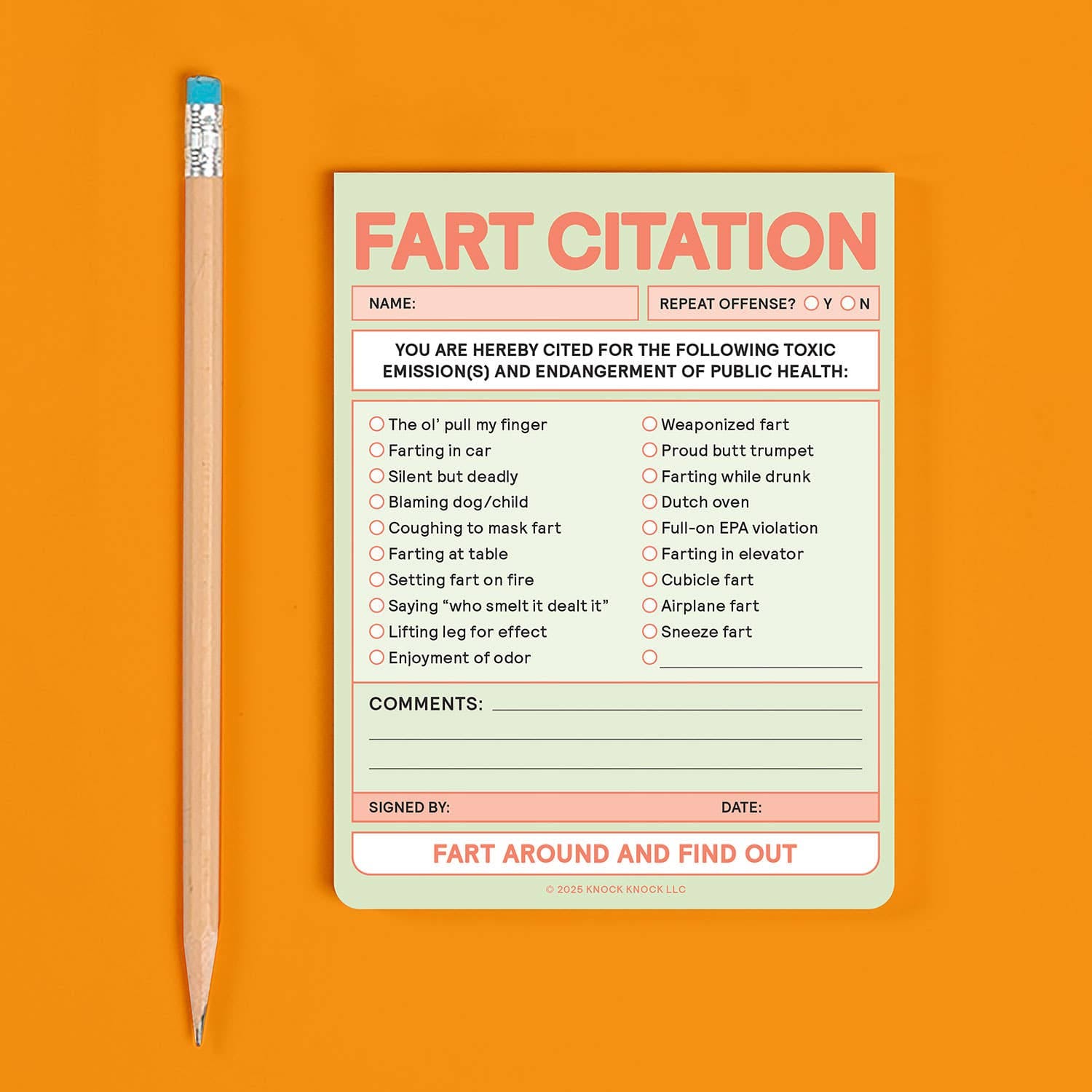 As a responsible citizen it's your duty to police other people's behavior–the good, the bad, and the gassy. Issue this semi-official-ish citation for squeezing the breeze and cutting the cheese, whether offenders are friends, coworkers, loved ones, or total strangers. Do your part to enforce clean-air standards, not to mention good manners!