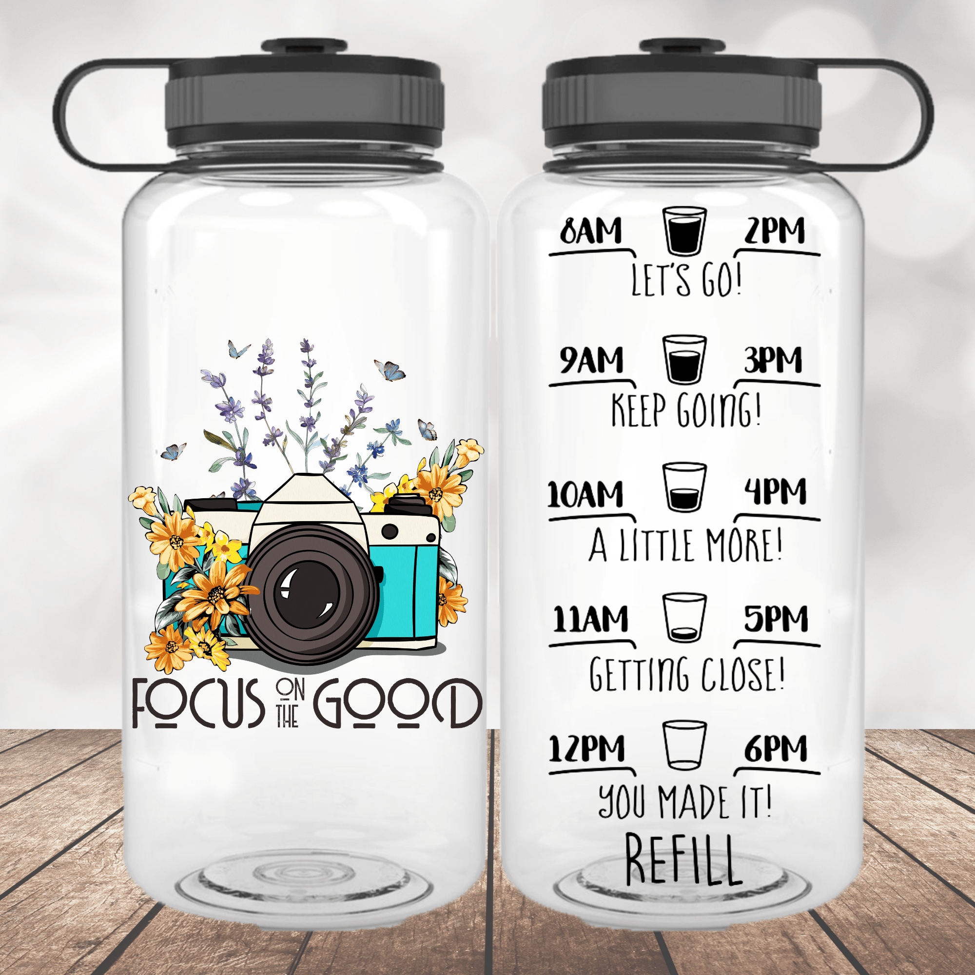 The bottle is a 34oz single wall Eastman Tritan™ water/sport bottle. Tritan is a tough, shatter-resistant, 100% BPA free copolyester that can withstand sub-freezing and boiling temperatures. The black plastic twist-on cap is attached to the bottle via a tethered strap.