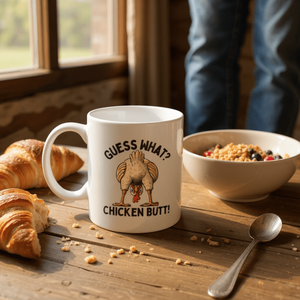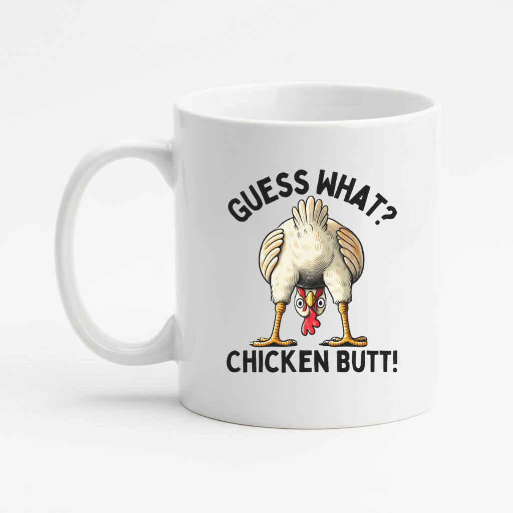 Brighten your mornings with the Guess What? Chicken Butt! Mug, designed to bring a hearty chuckle with every sip. Showcasing a cheeky chicken looking between its legs, this playful mug combines humor and whimsy, making it the perfect conversation starter at your breakfast table. Whether you're gearing up for a busy day or enjoying a relaxing moment, this mug adds a lighthearted touch to your coffee or tea routine. It’s an ideal gift for anyone who appreciates a good pun and loves to start the day with a smile. Make every cup memorable with this fun and unique mug!