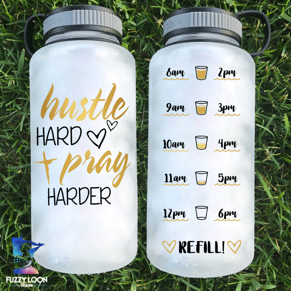 Hustle Hard, Pray Harder. Words to live by. You can keep this bottle with you to motivate you all day long both spiritually and physically.