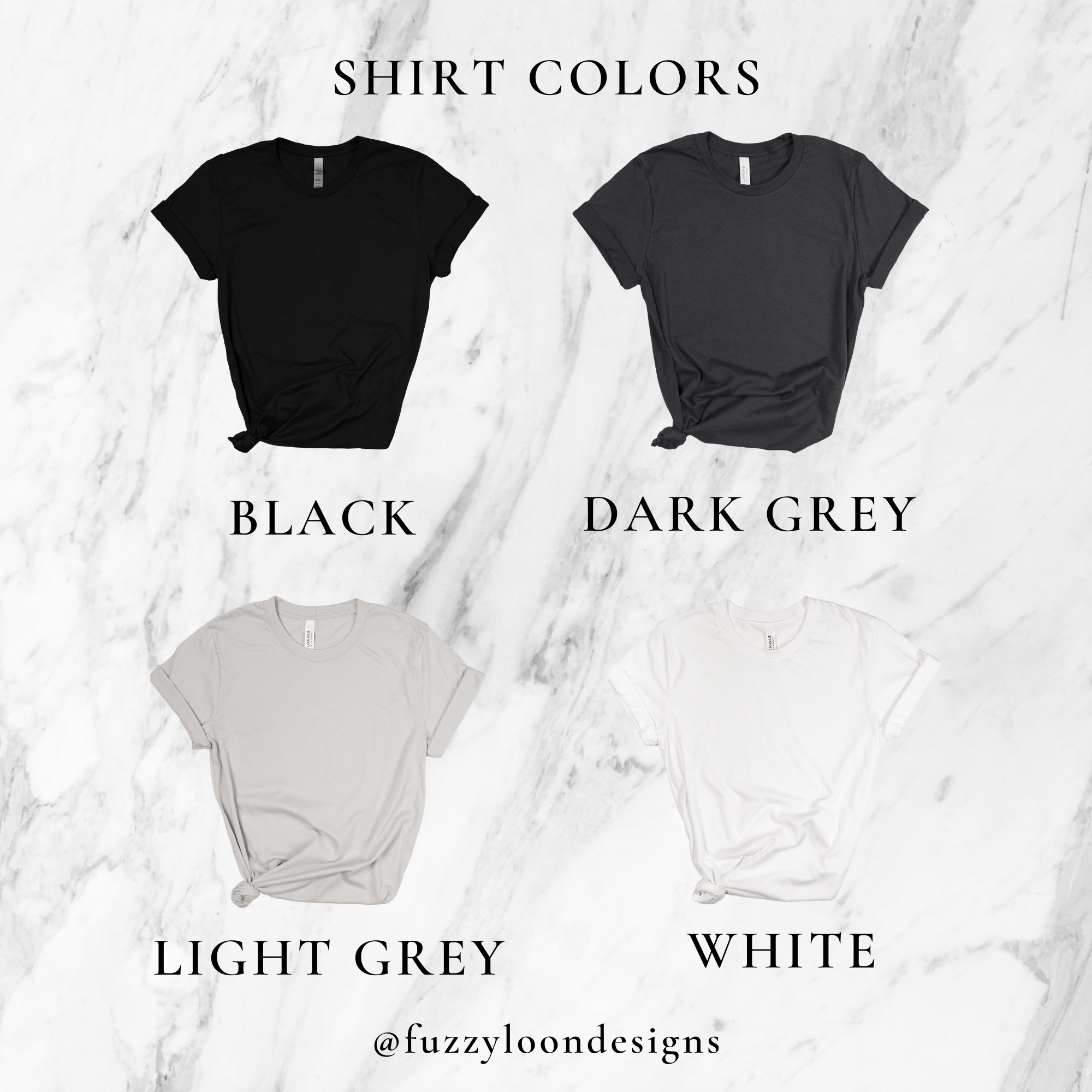 Bella + Canvas Tees are unisex fit, so be sure to size accordingly. Available in black, white, dark grey, and light grey.