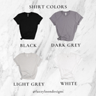 Bella + Canvas Tees are unisex fit, so be sure to size accordingly. Available in white, light grey, dark grey, and black.