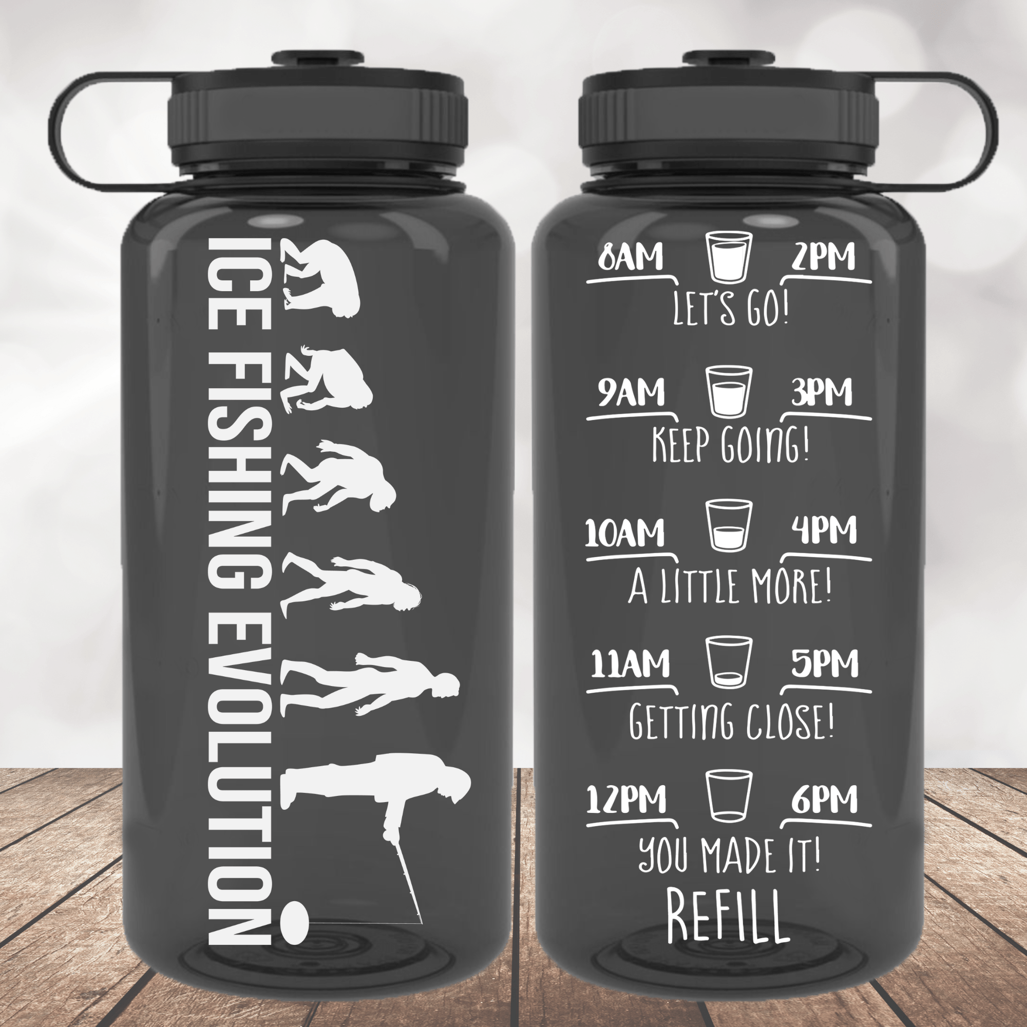 Ice Fishing Evolution Design is WHITE and shown on our Charcoal Grey Bottle.
