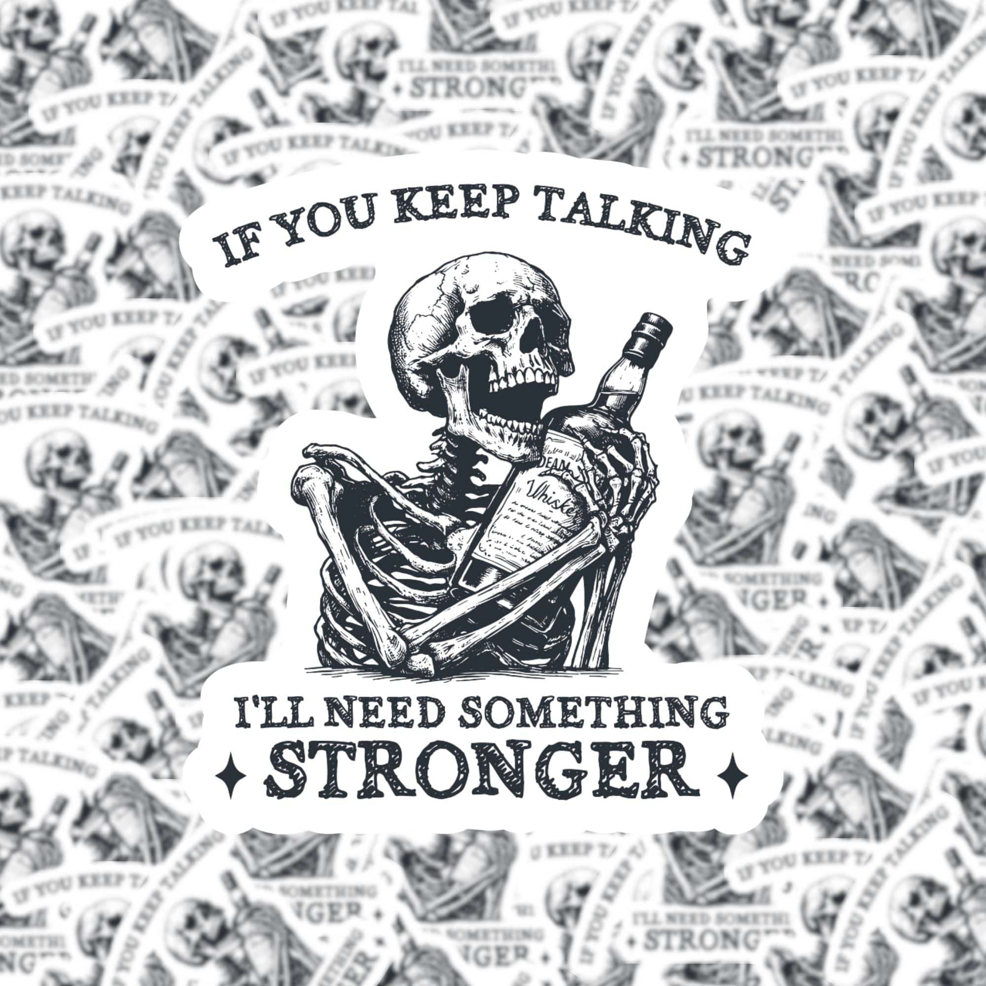 Don't let your words run amok with this 'If You Keep Talking Sticker' featuring a skeleton holding a bottle of whisky. If your chatter gets too much, this sticker will have you reaching for some stronger spirits. Keep things light-hearted with this quirky addition to your sticker collection.