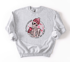 Embrace the chill with this cozy crew sweatshirt featuring a moody skeleton sporting a pink beanie, cradling an iced pink coffee while snowflakes swirl around. Perfect for those who run cold on the outside and even colder on the inside. Soft, comfortable, and unapologetically sarcastic—because sometimes the best way to survive winter is with a little dark humor and maximum comfort.