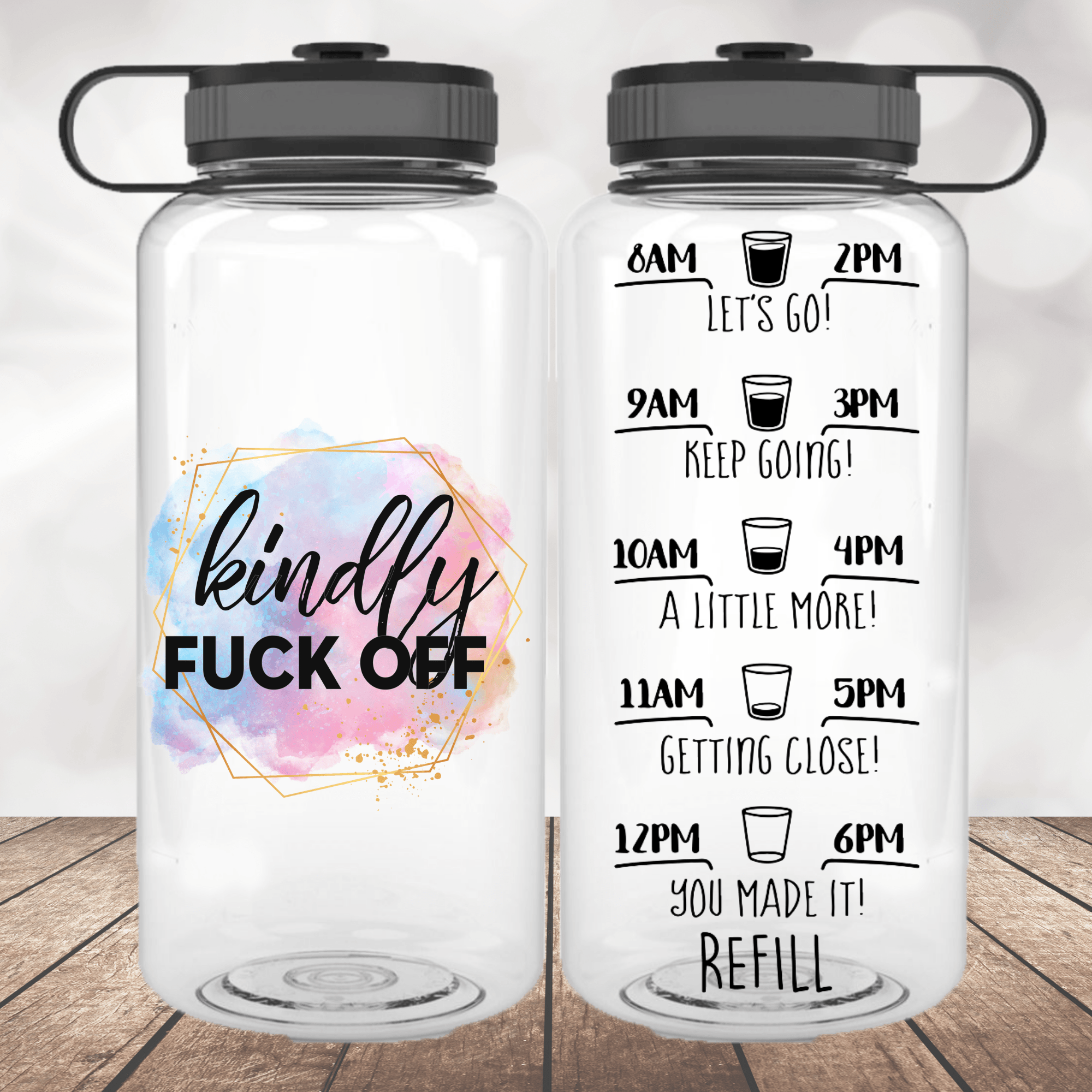 The bottle is a 34oz single wall Eastman Tritan™ water/sport bottle. Tritan is a tough, shatter-resistant, 100% BPA free copolyester that can withstand sub-freezing and boiling temperatures. The black plastic twist-on cap is attached to the bottle via a tethered strap.