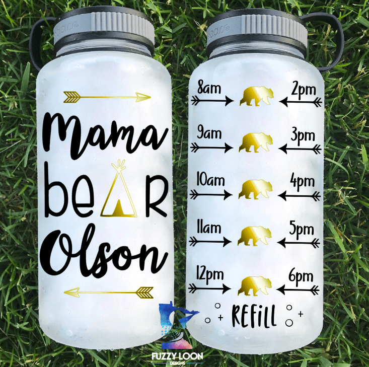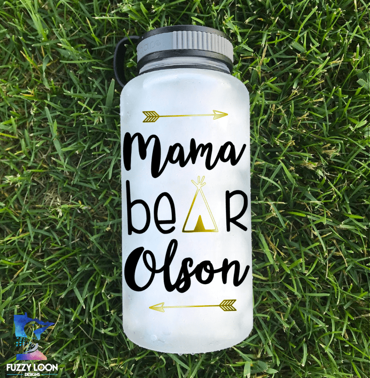 This classic mama bear water bottle is personalized with your name. "Mama Bear (Your Name)"