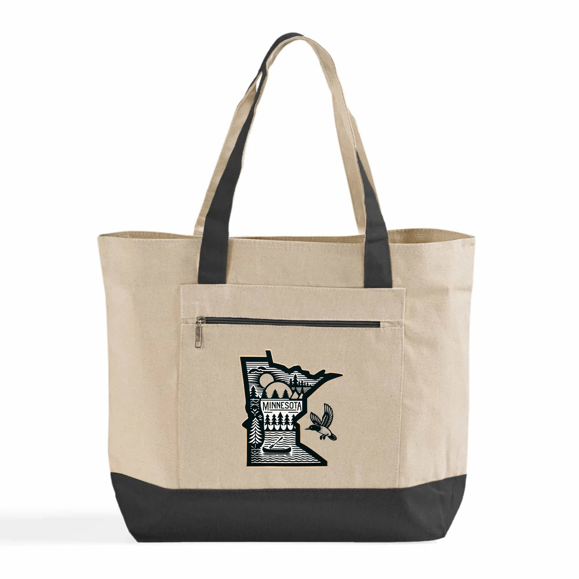 Celebrate Minnesota’s natural beauty with the Minnesota Black and White Canvas Tote. Featuring a detailed state outline accented by iconic elements like a flying loon, lakes, and trees, this tote captures the essence of Minnesota’s landscape in a stylish monochrome design. Durable and spacious, it’s perfect for everyday use, allowing you to carry your essentials while proudly showcasing your connection to the North Star State.