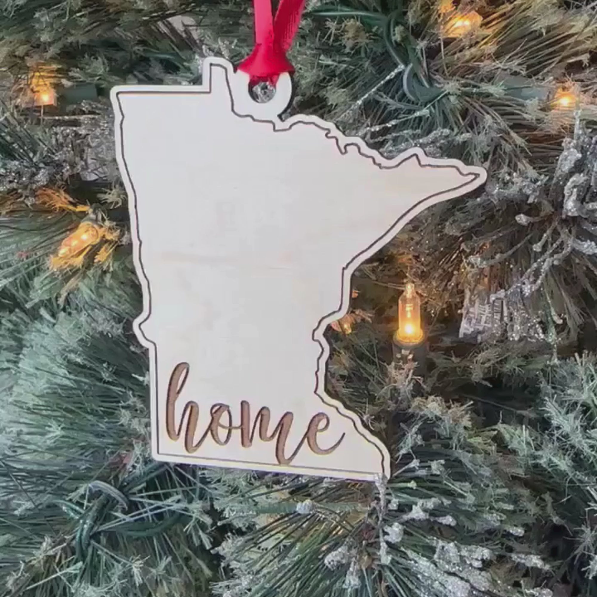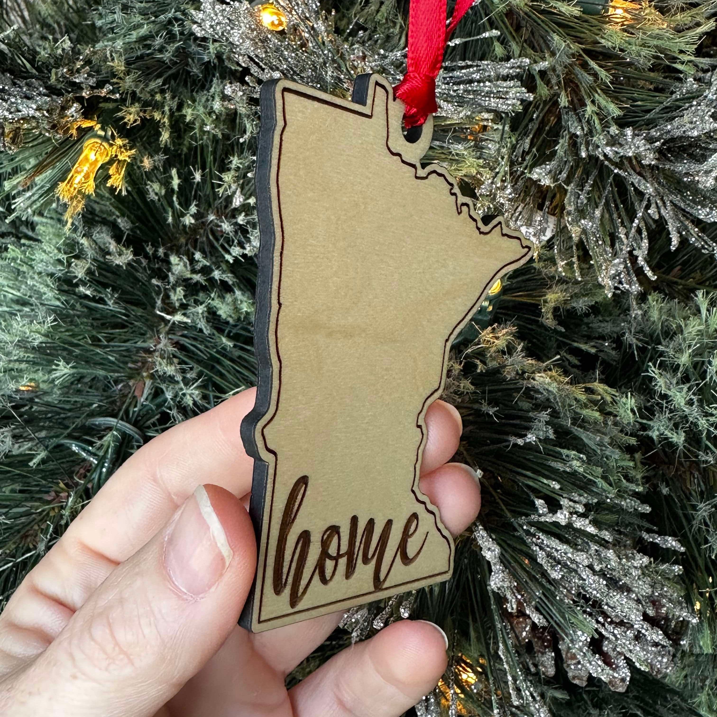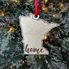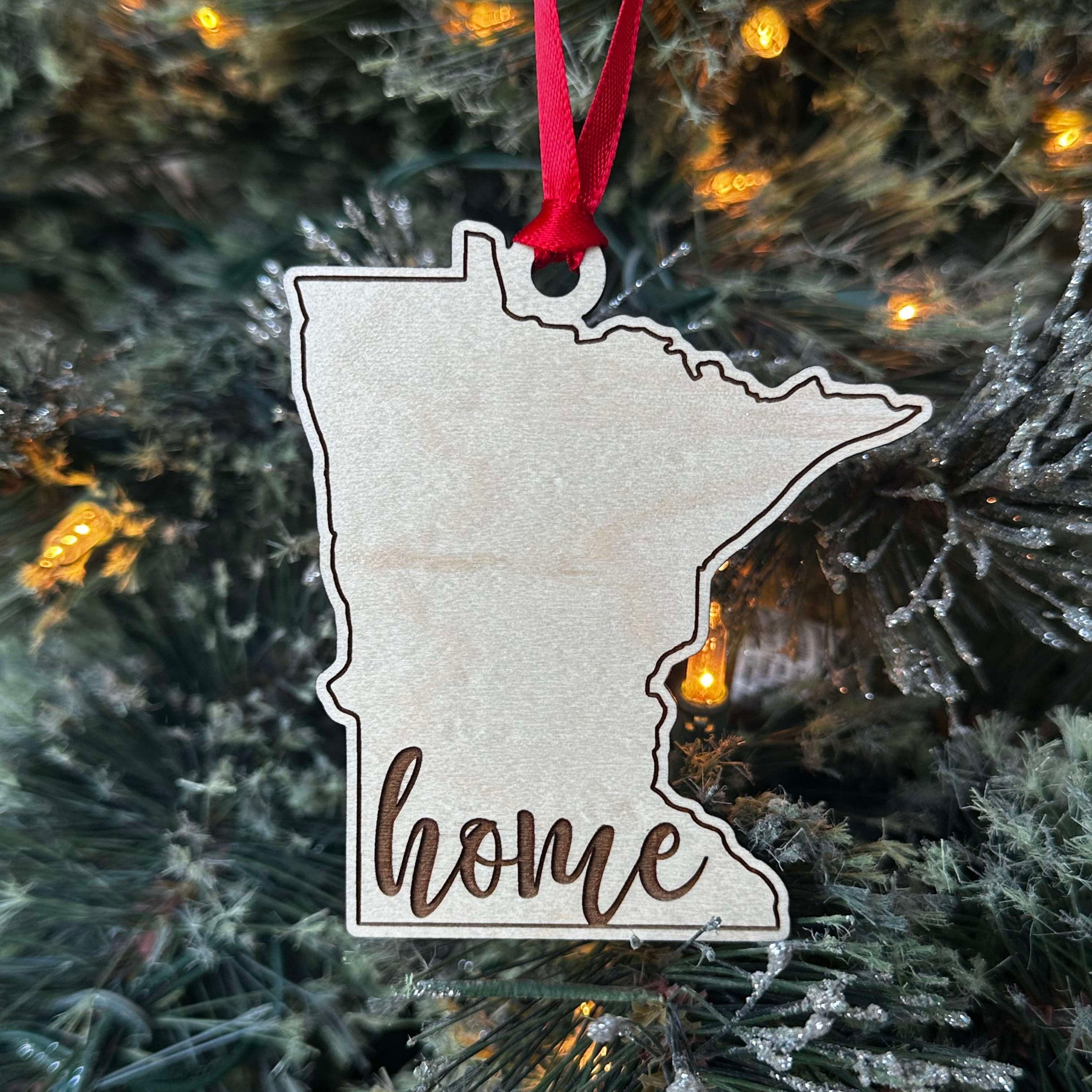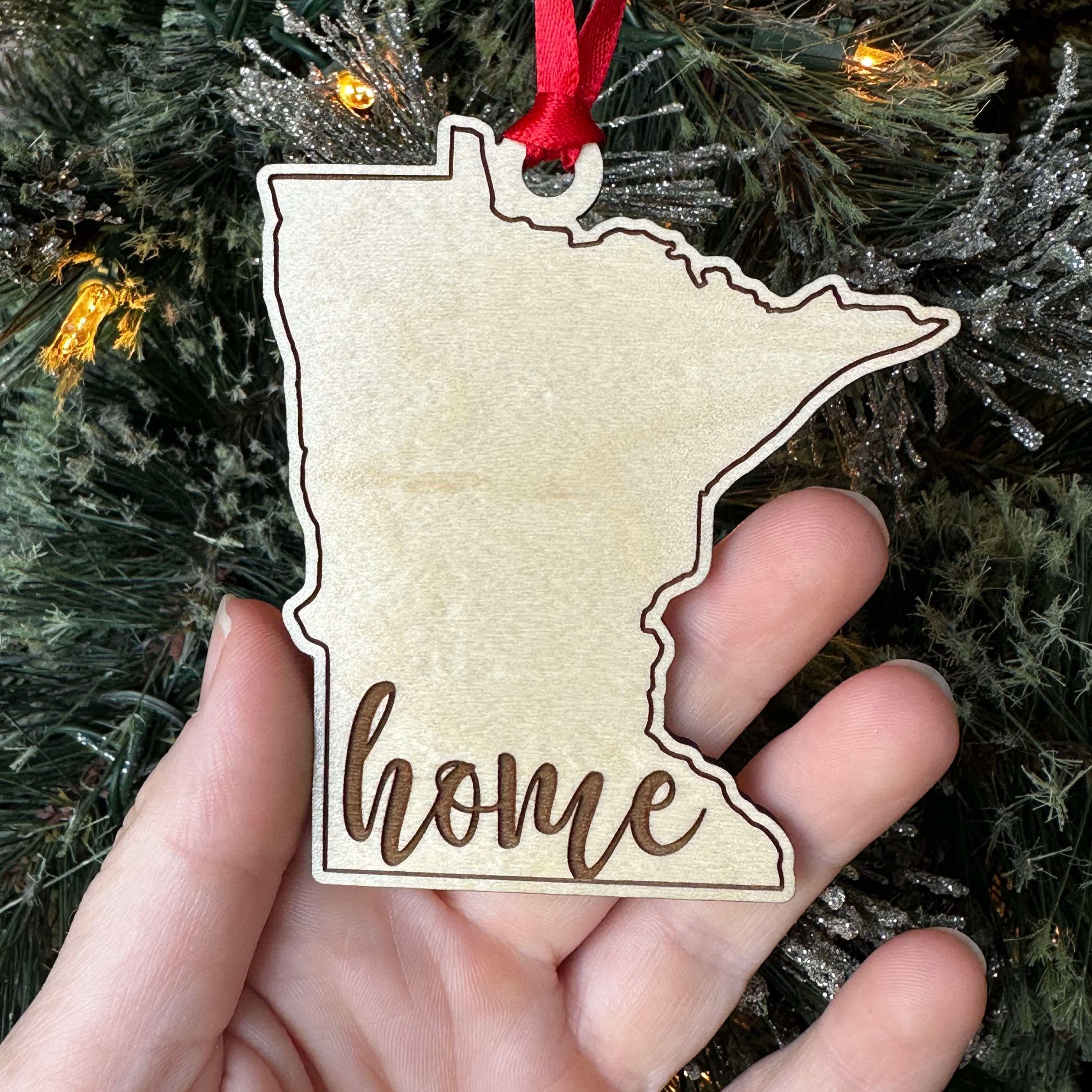 This charming wood ornament features a Minnesota-shaped design with the word "home" inscribed inside.