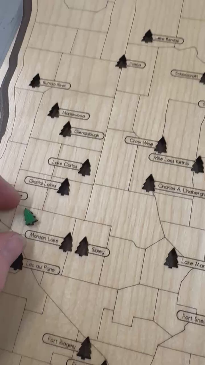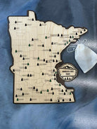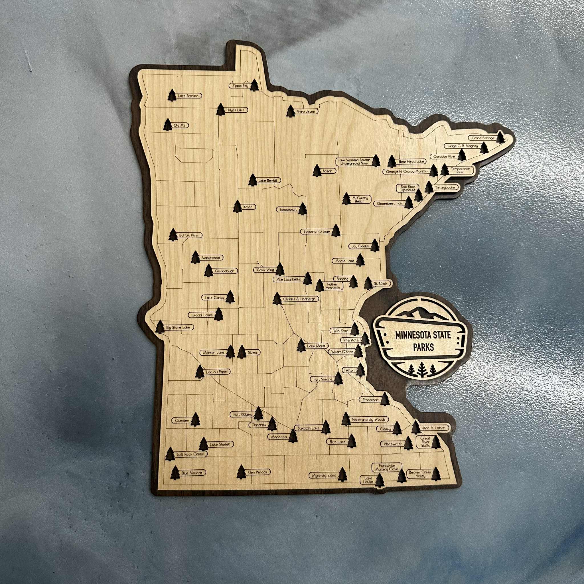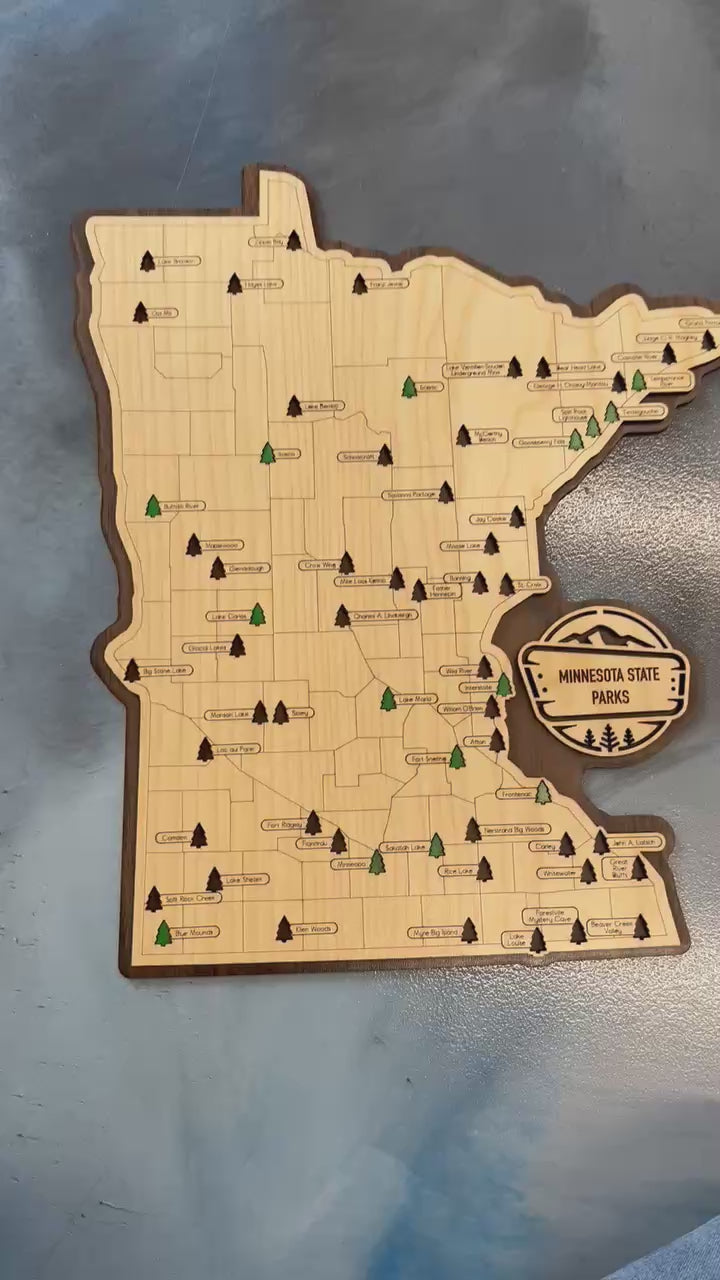Decorated with an outdoorsy theme, these maps come with adhesive-backed trees to mark your journeys. Each map is unique since they are made from wood. The front of the map is a lighter wood tone, the backing is a darker tone. We use what we can locally source first and what is currently available. Wood tones are subject to change. We use a variety of wood including Maple, Birch, Cherry, and Dark Oak. All finished with a UV coating to help the wood last for years to come.