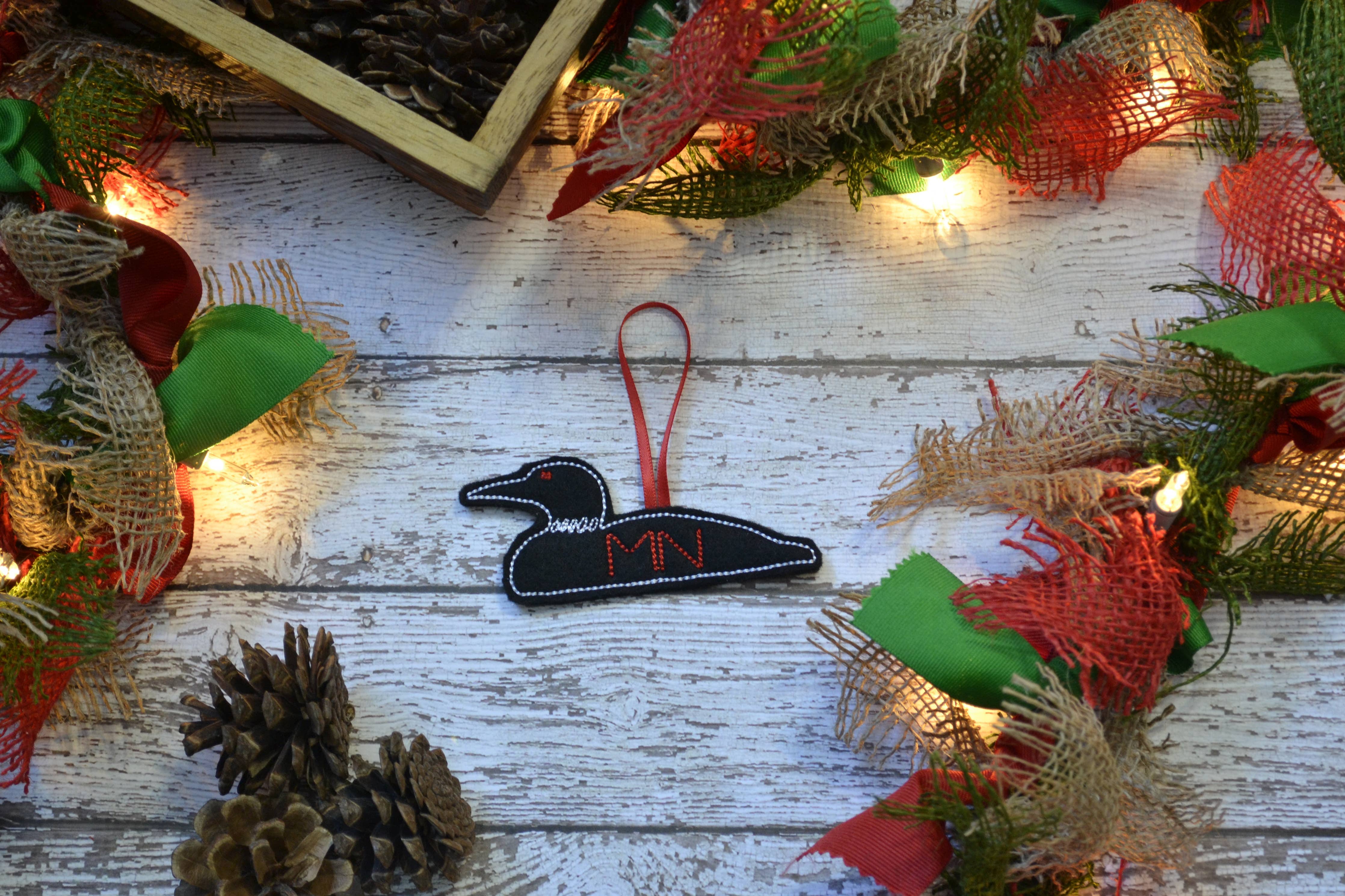 Get ready to add some charm to your tree with our MN Loon Embroidered Felt Ornament! Take a closer look at its playful size- 2" x 4"- and you'll see it comes equipped with a 2" ribbon loop for effortless hanging. Talk about easy decoration! Perfect for adding a touch of nature to your holiday decor.