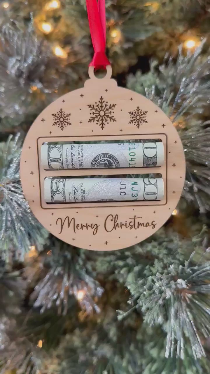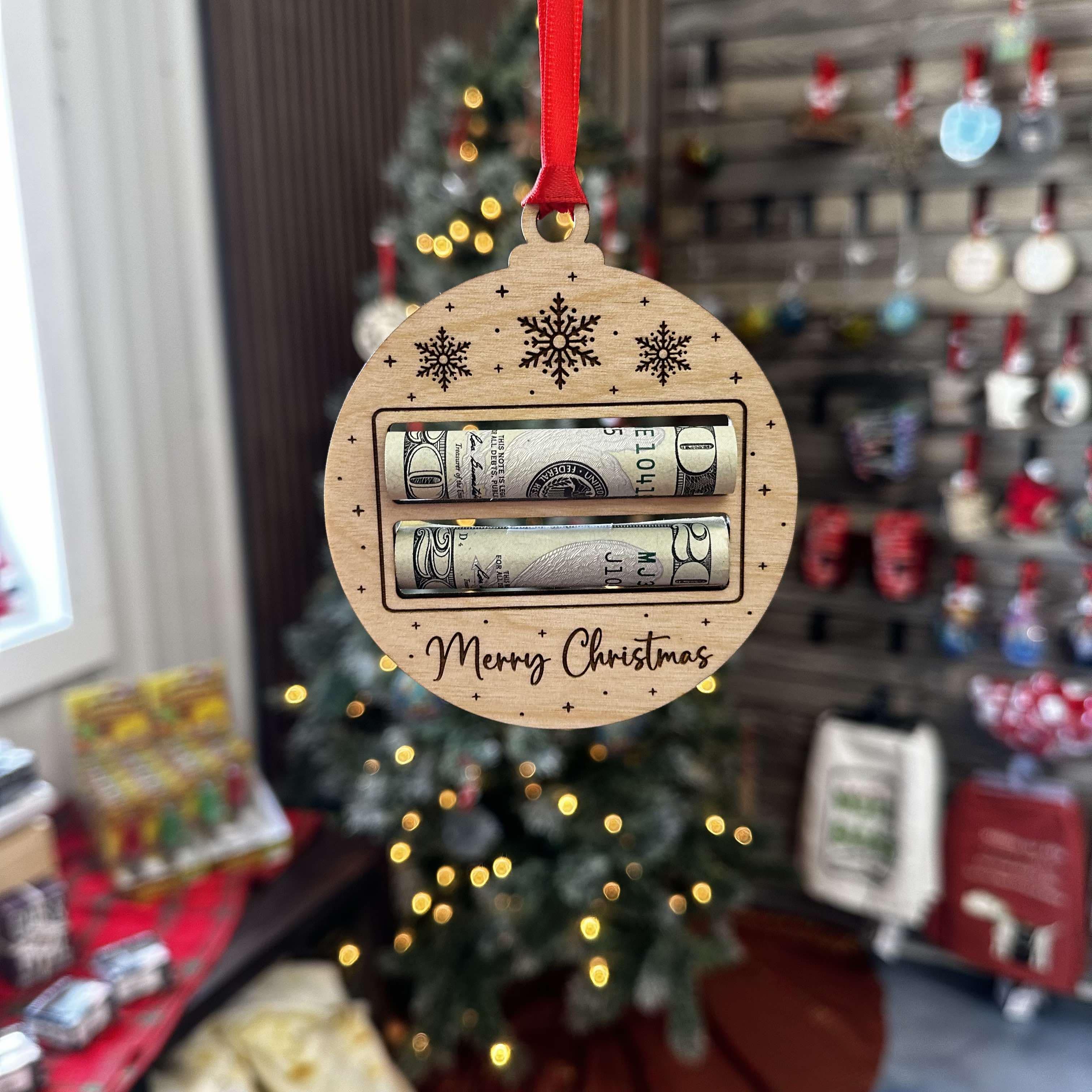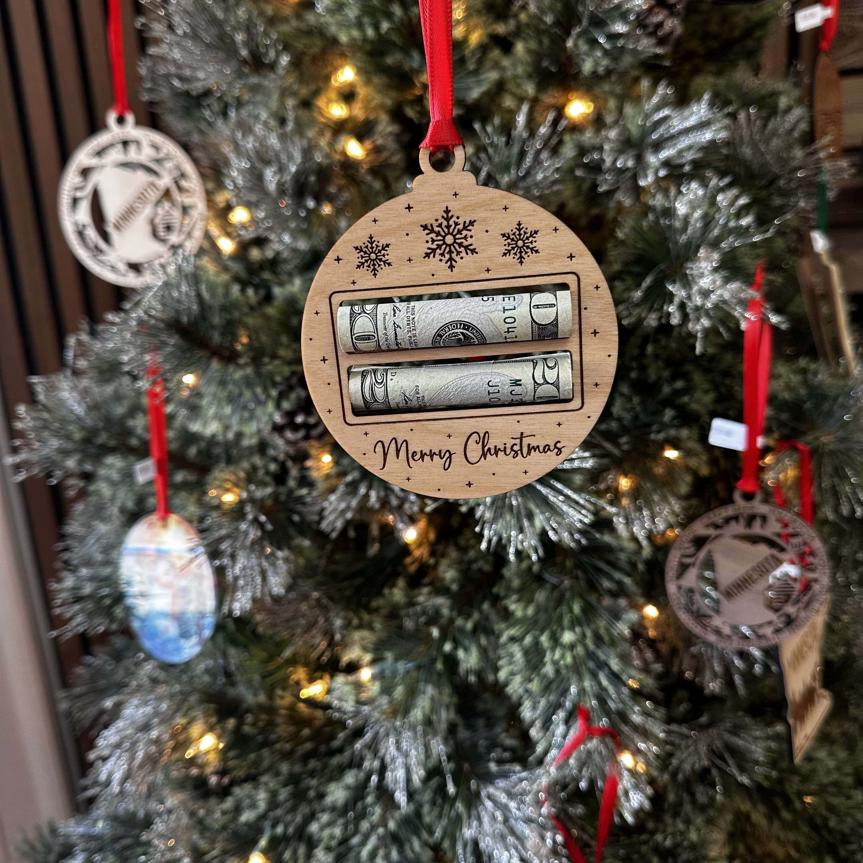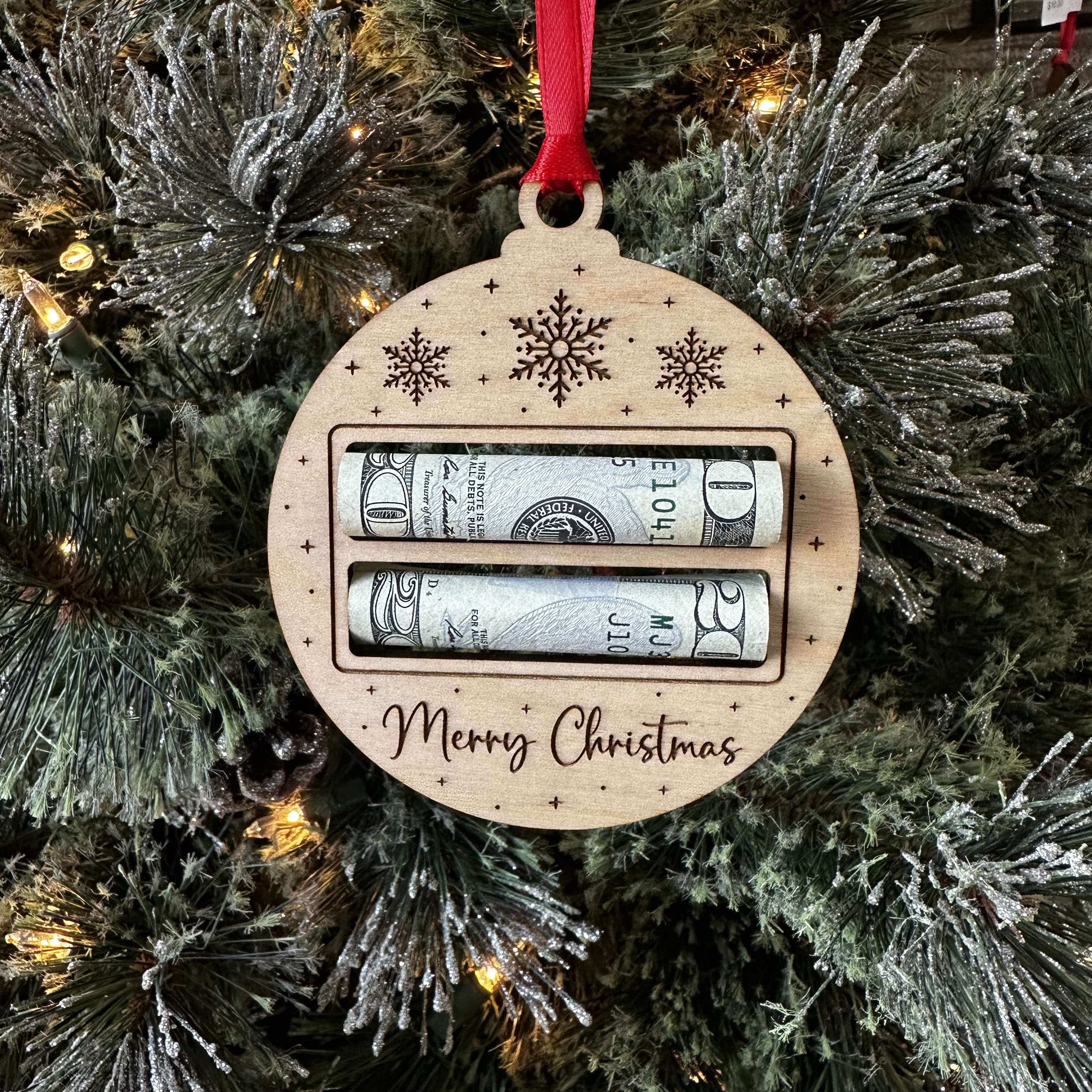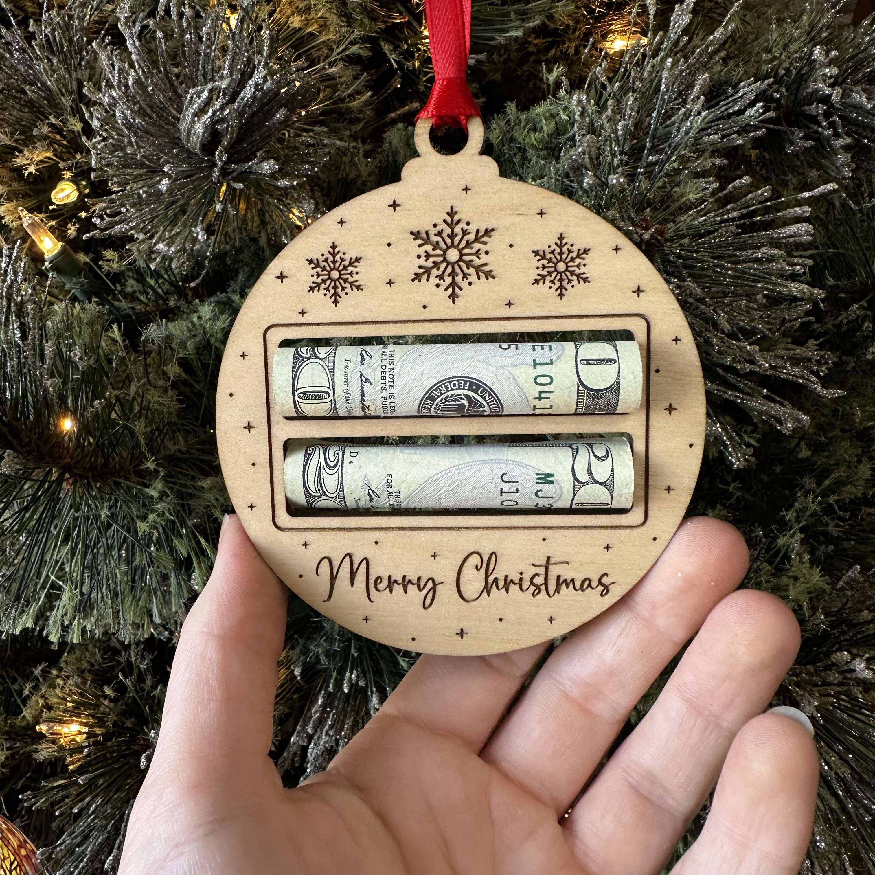Give the gift of cash this Christmas with our Money Ornament. This fun and festive ornament is a unique and thoughtful way to give money, adding a special touch to your gift. Perfect for any recipient, make their holiday even merrier with the Money Ornament.