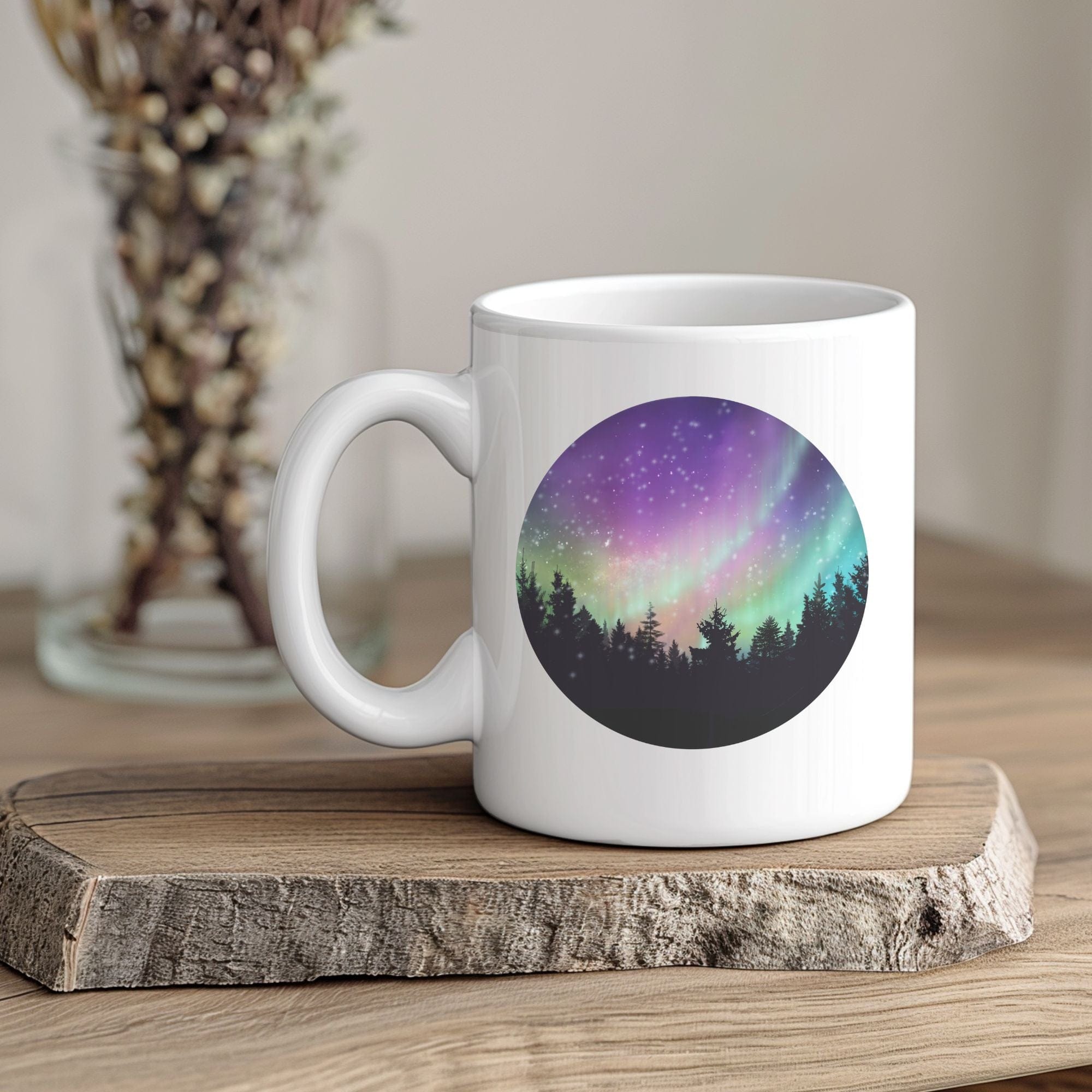Indulge in the beauty of the Northern Lights while sipping your morning coffee with our Northern Lights Mug. Its circular design showcases the stunning purple and green hues, making it a perfect addition to your mug collection. With a 15oz capacity, it's also practical and easy to clean - microwave and dishwasher safe.