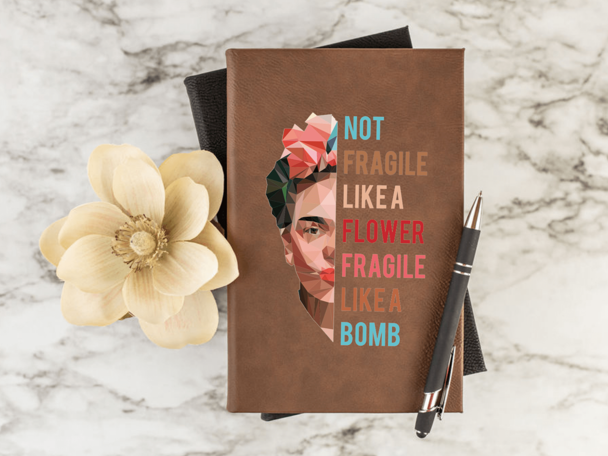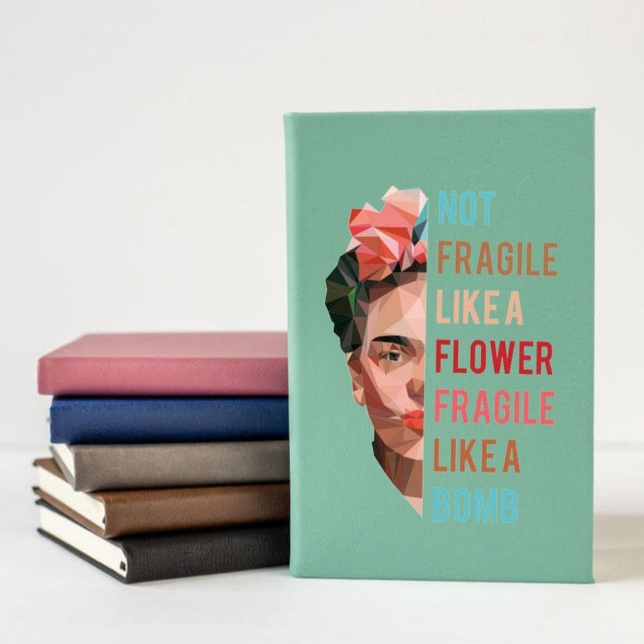 This beautiful leatherette journal printed with the design, Not Fragile Like Flower, Fragile Like A Bomb.