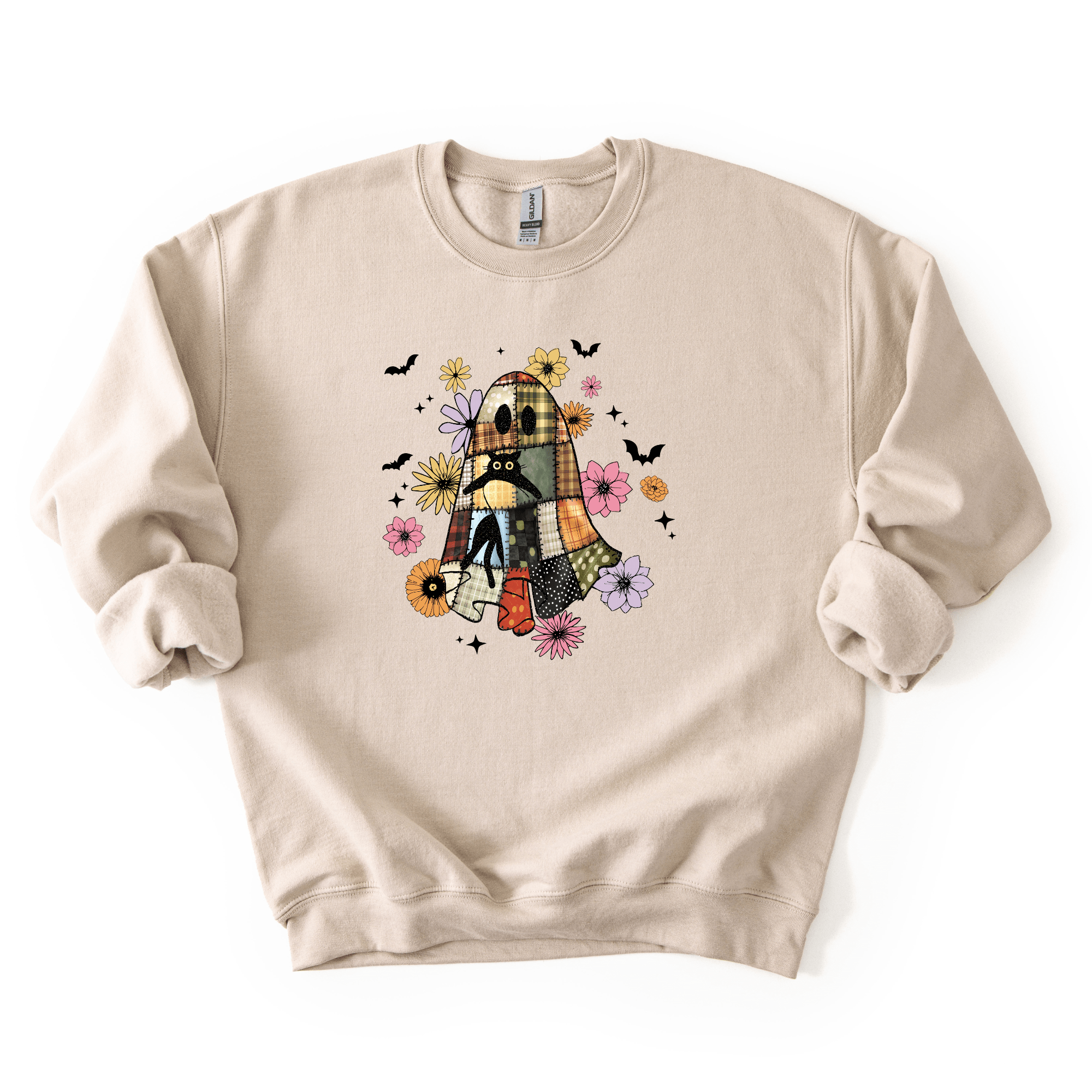 Embrace cozy style with the Patchwork Ghost Comfy Crew Sweatshirt, featuring a charming patchwork ghost gently holding a black cat. This unique design adds a playful, comforting touch to your casual wardrobe while keeping you warm and relaxed. Perfect for fall evenings or lounging at home, this sweatshirt combines softness with eye-catching detail, making it a standout favorite for anyone who loves whimsical, cozy fashion.