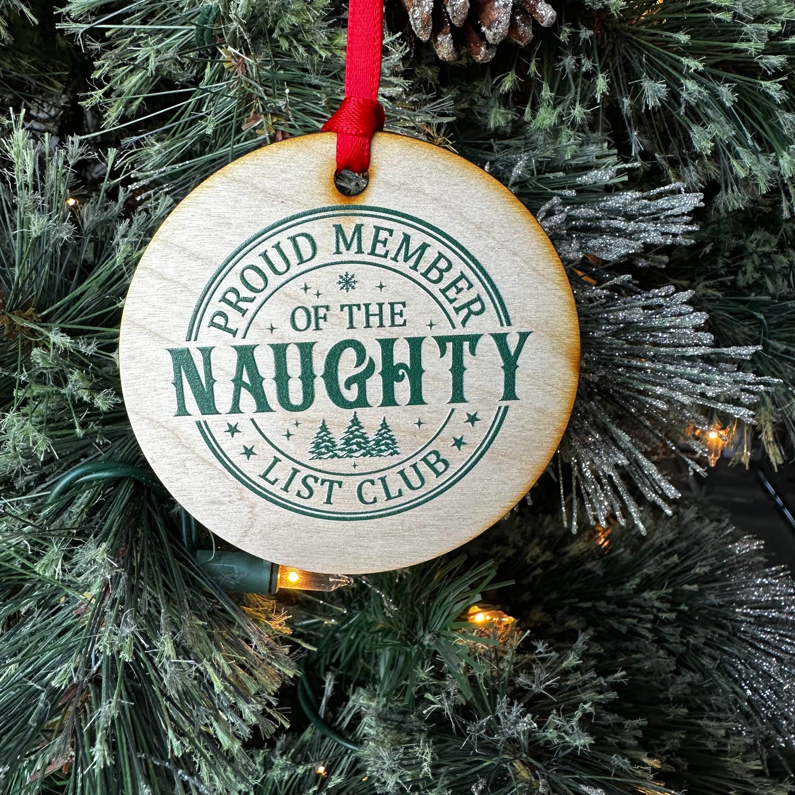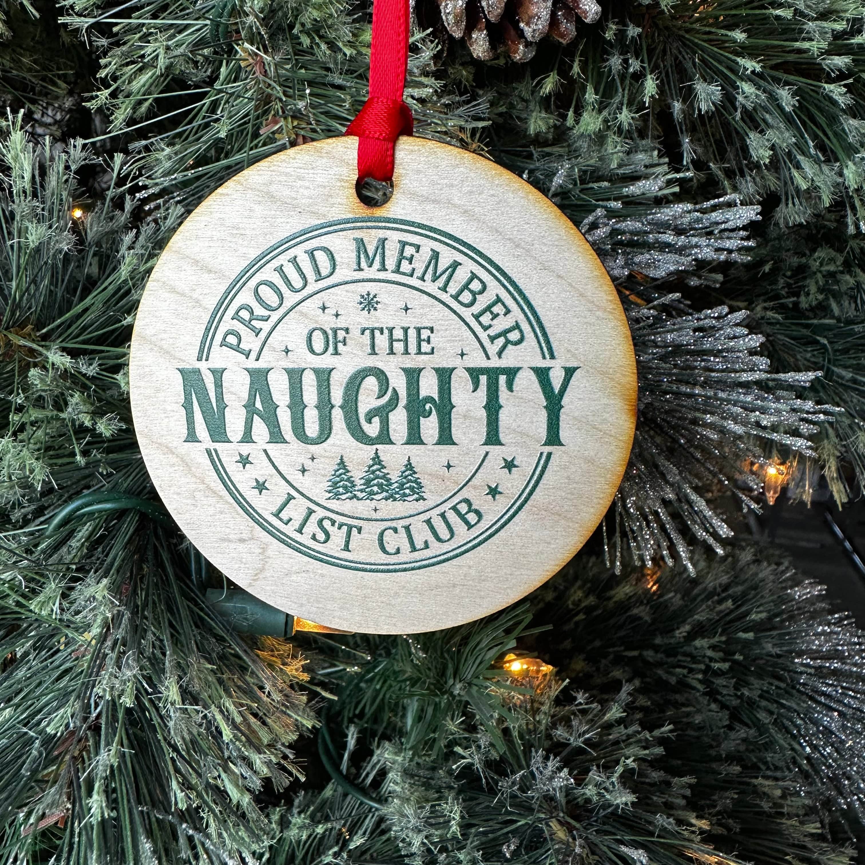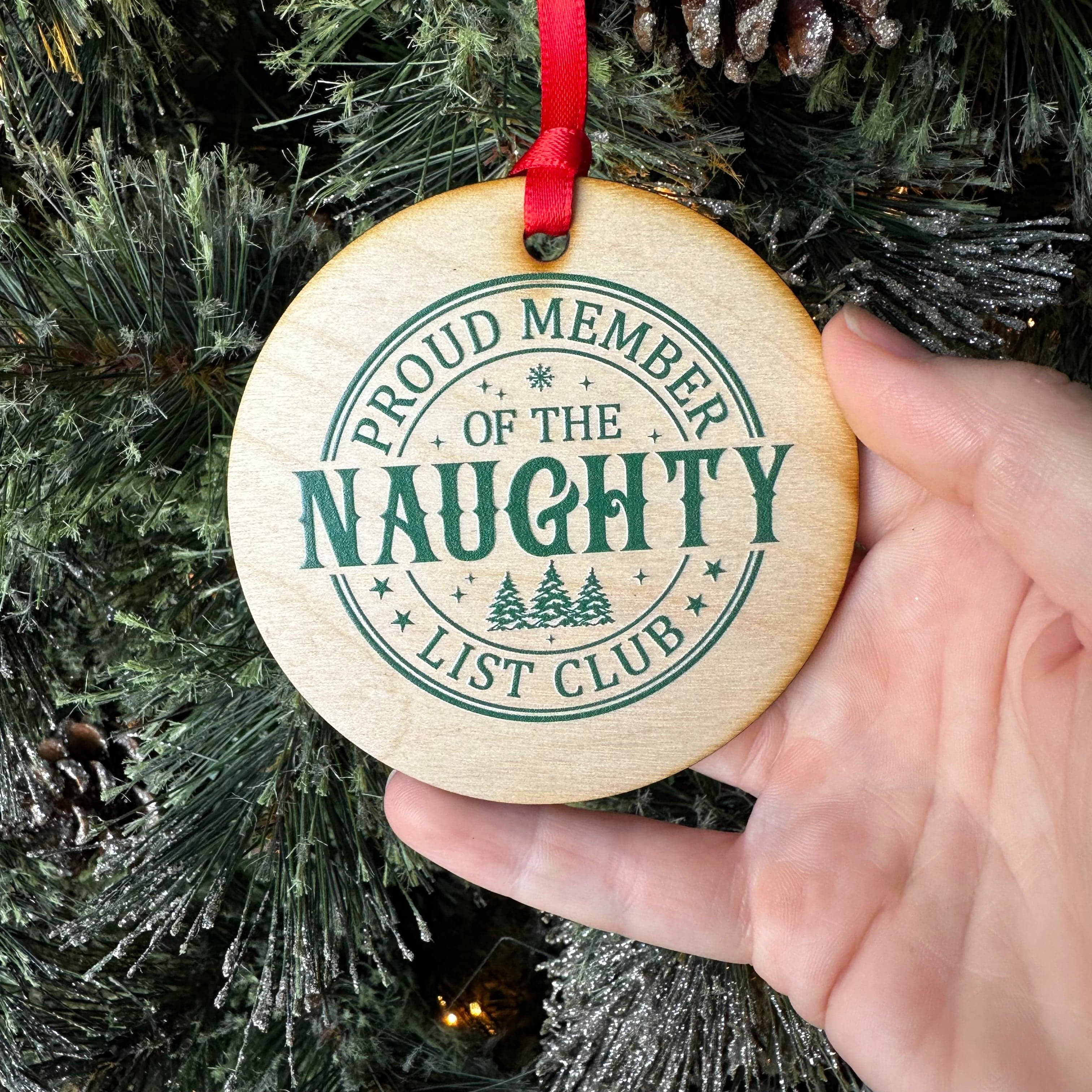 Join the naughty list in style with our Proud Member of the Naughty List Club Wood Ornament! This funny gift is perfect for those who embrace their mischievous side and aren't afraid to show it off. Hang it on your tree or give it as a gift to spread some laughter this holiday season.