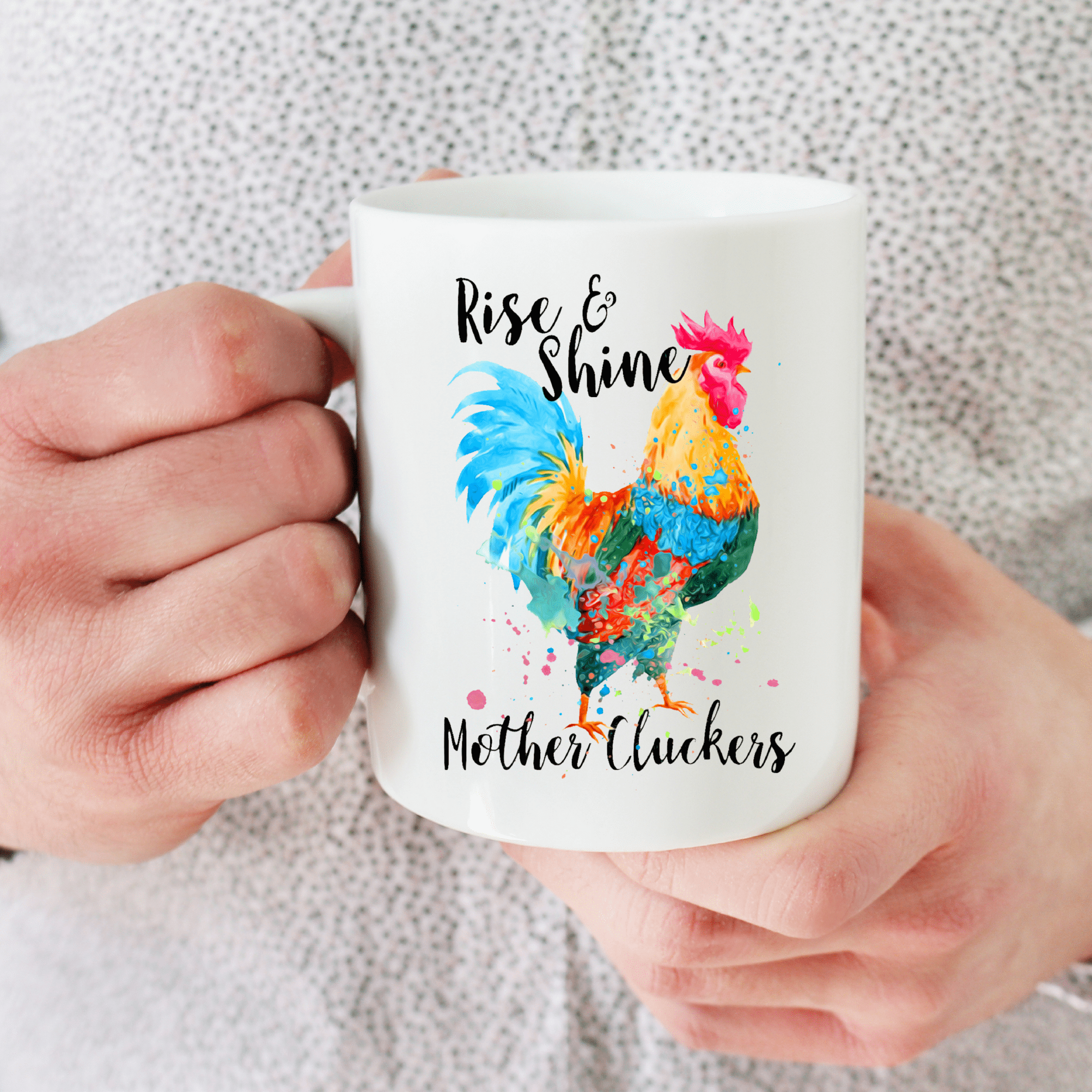 This might be the perfect design for your morning cup of joe! Rise and Shine Mother Cluckers! Design is a beautiful watercolor Rooster.