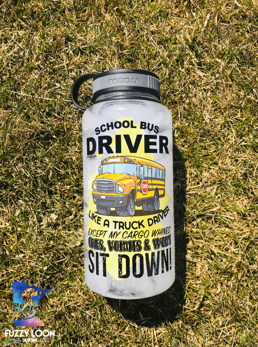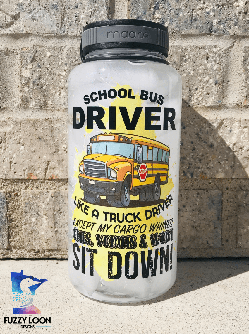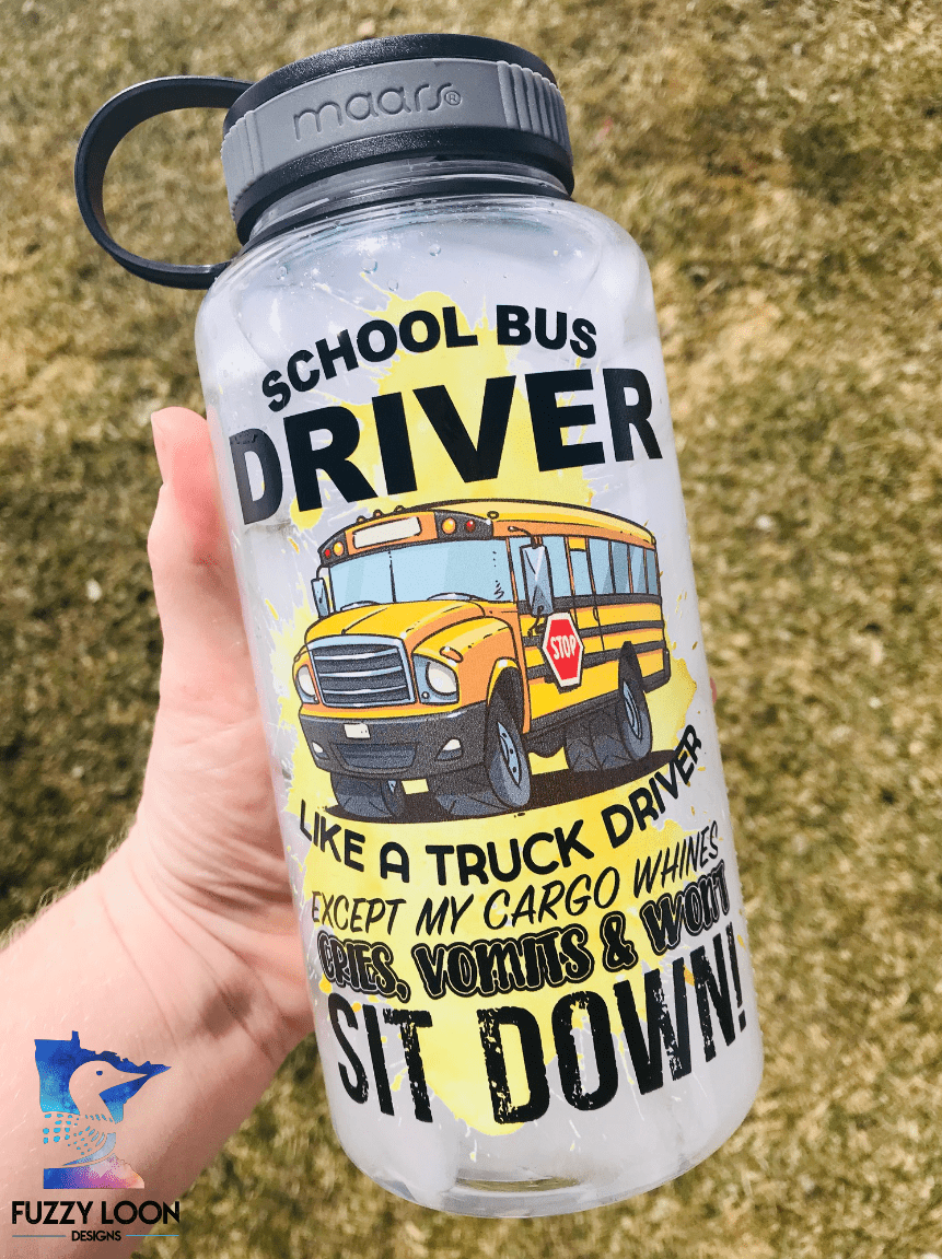 This cute school bus driver water bottle says “School Bus Driver, Like A Truck Driver Except My Cargo Cries, Vomits and Wont Sit Down!” The Words are printed with a picture of a school bus over a yellow ink splatter. The bottle is a 34oz single wall Eastman Tritan™ water/sport bottle. Tritan is a tough, shatter-resistant, 100% BPA free copolyester that can withstand sub-freezing and boiling temperatures. The black plastic twist-on cap is attached to the bottle via a tethered strap.