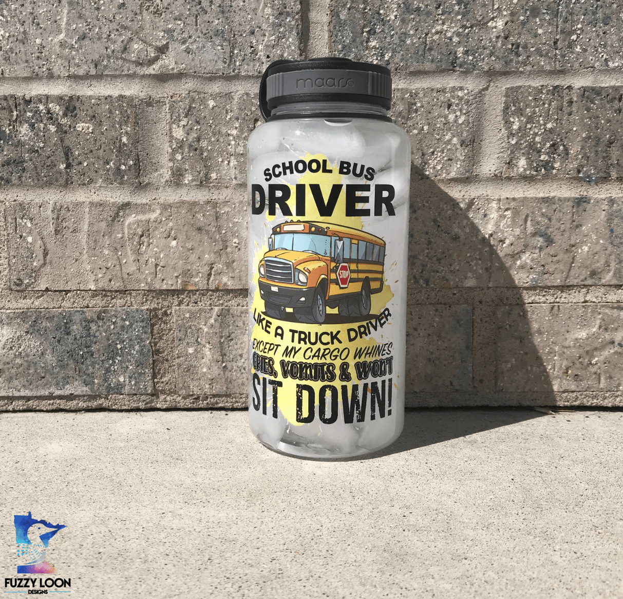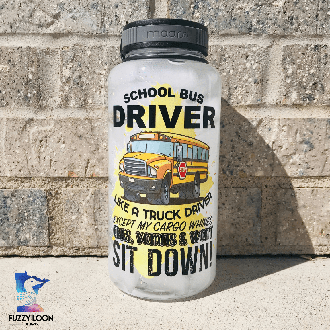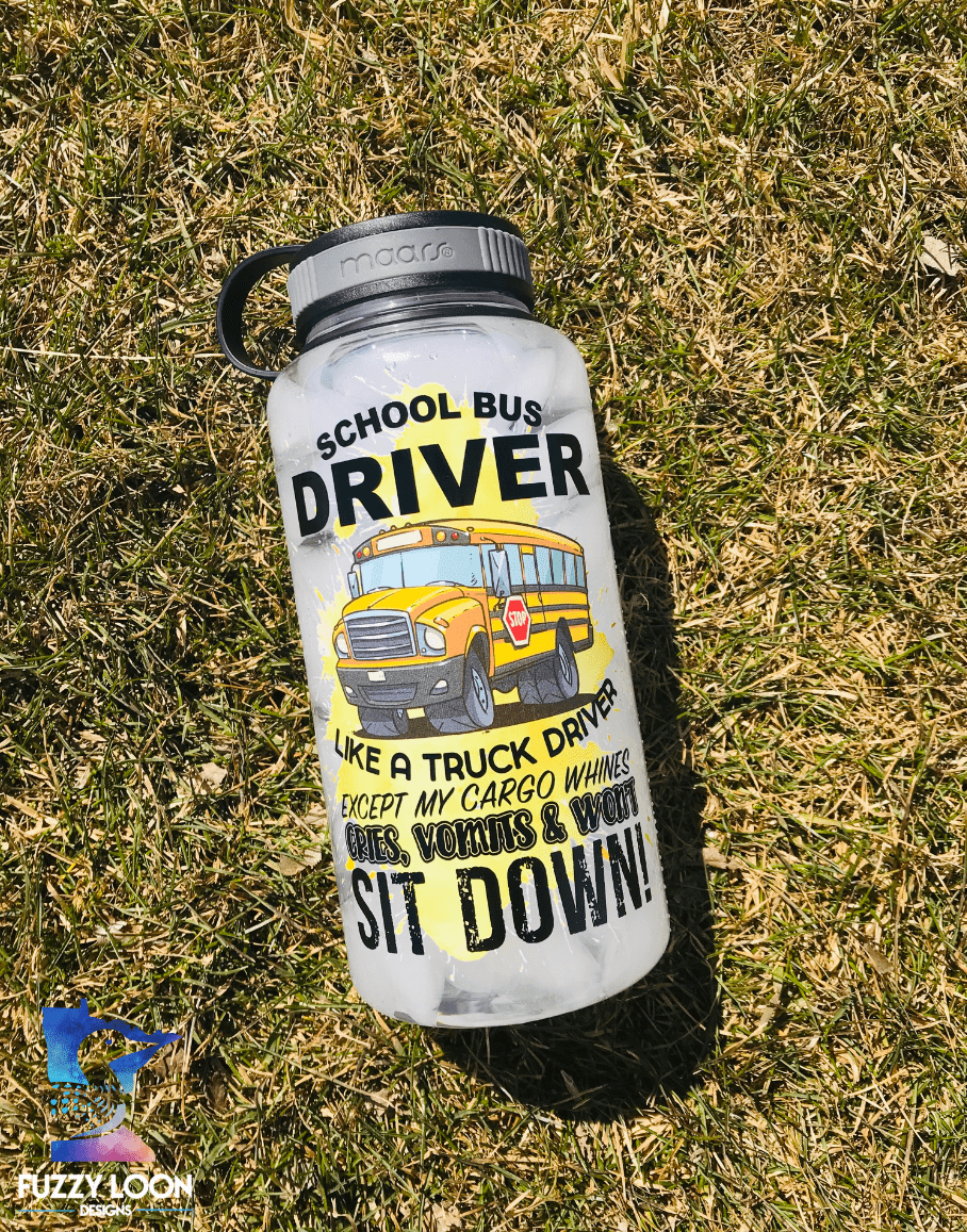 This cute school bus driver water bottle says “School Bus Driver, Like A Truck Driver Except My Cargo Cries, Vomits and Wont Sit Down!” The Words are printed with a picture of a school bus over a yellow ink splatter. The bottle is a 34oz single wall Eastman Tritan™ water/sport bottle. Tritan is a tough, shatter-resistant, 100% BPA free copolyester that can withstand sub-freezing and boiling temperatures. The black plastic twist-on cap is attached to the bottle via a tethered strap.