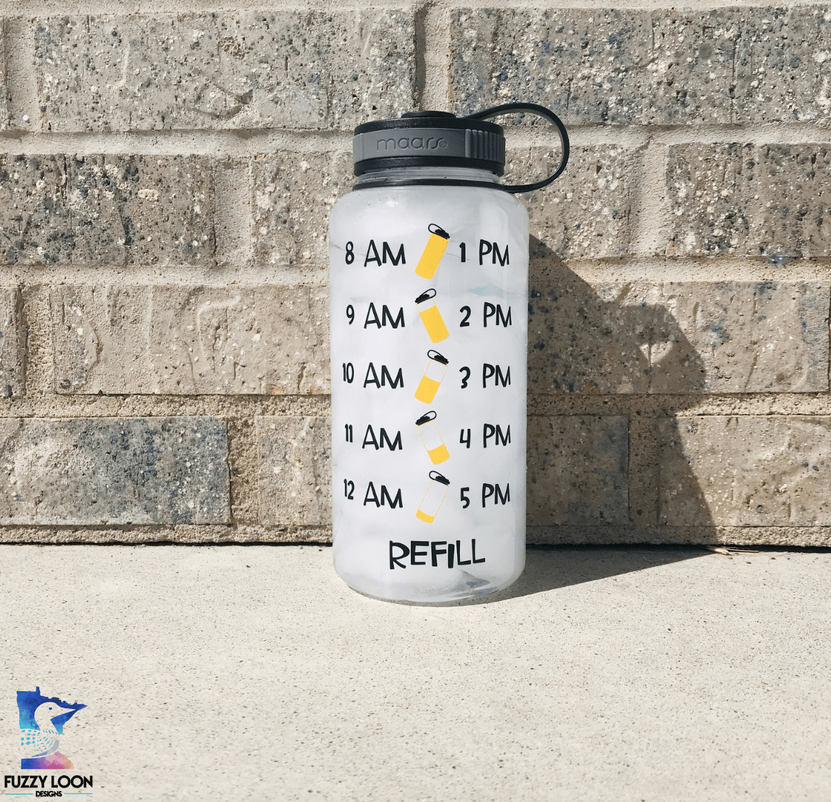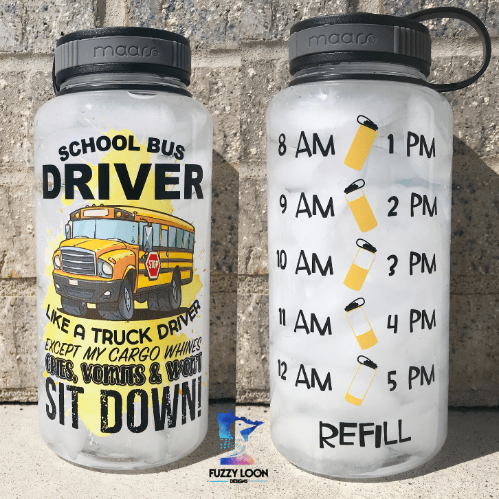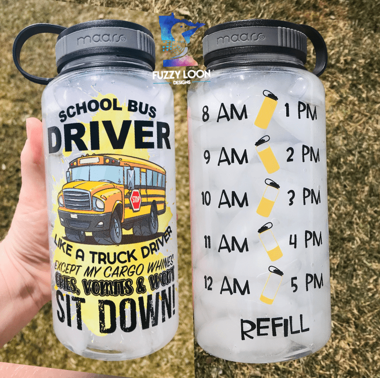 Need to drink more water!? The water table on the back starts at 8am and helps you drink your water all day long. This is the perfect water bottle for any school bus driver.