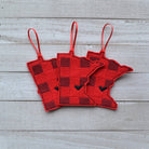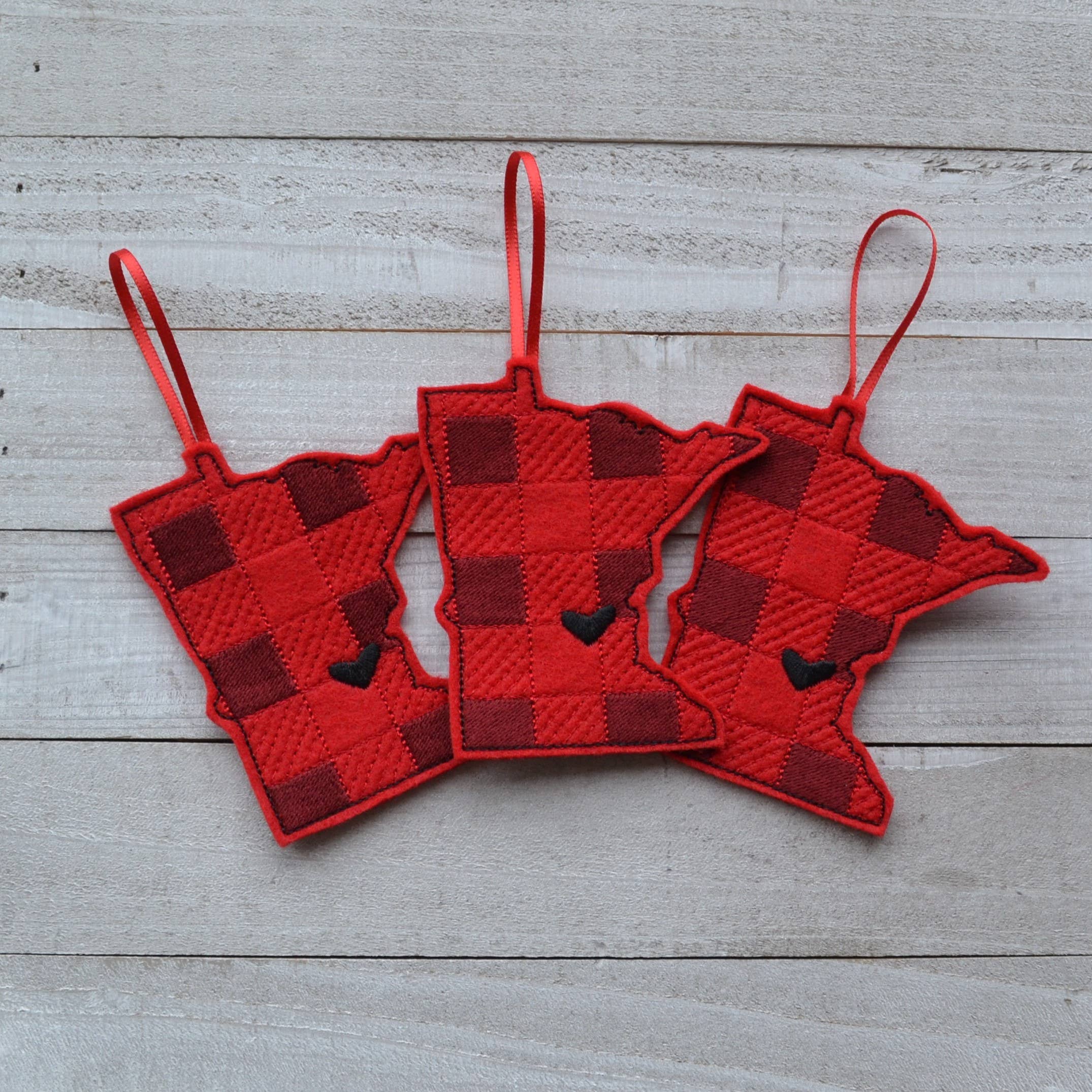 Deck the halls with this adorable Red Felt embroidered plaid Minnesota ornament! At approximately 3.5-4"H x 3.5-4"W and featuring a convenient 2" ribbon loop on top, this ornament will add a touch of quirky charm to your holiday decorations. It's the perfect way to infuse your home with some festive fun (and show off your love for Minnesota, of course)!