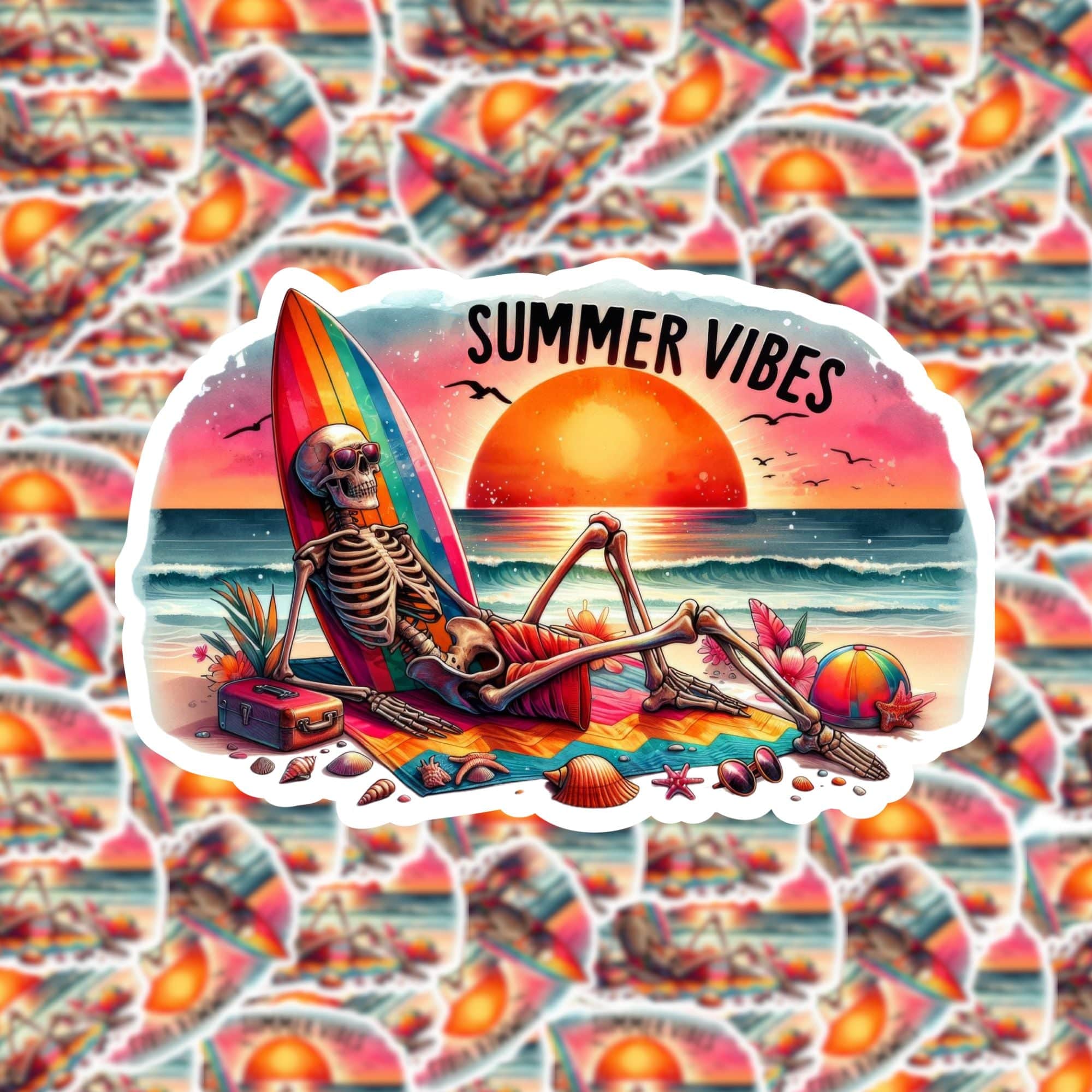 Get in the summer mood with our Summer Vibes Skeleton Sticker! This cheeky sticker features a skeleton enjoying a drink with an umbrella, watching the stunning sunset at the beach. Stick it on your surfboard, cooler, or anywhere else to add a touch of fun and humor to your summer vibes. Cheers!
