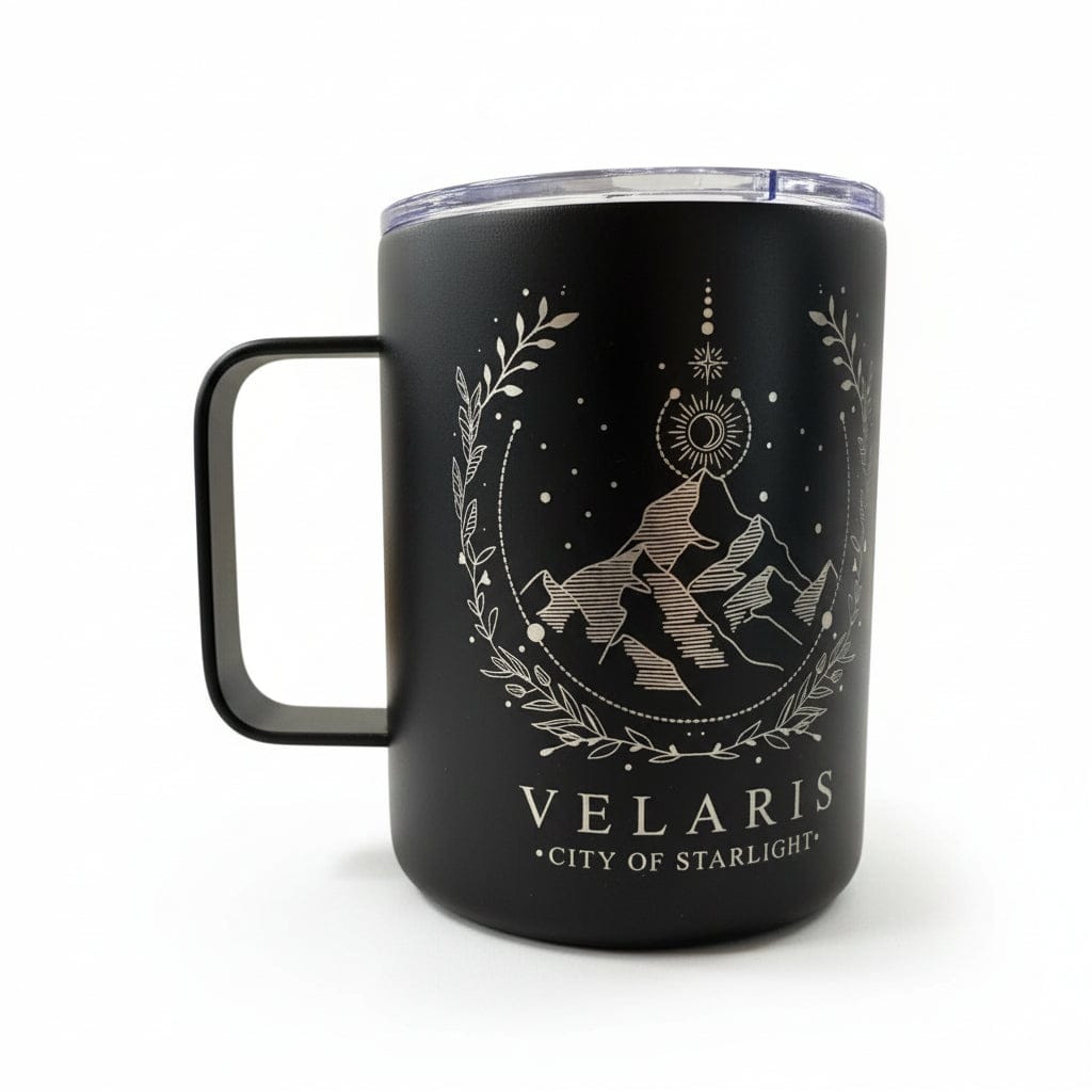 Sip your favorite brew while daydreaming about the City of Starlight. This sleek black 12oz insulated mug keeps your coffee hot (or cold drinks cold) for hours, so you can stay cozy during those epic reading marathons. Perfect for ACOTAR fans who want to carry a piece of Velaris with them. Whether you're curled up with a book or conquering your day, this lid-sealed companion keeps spills at bay and vibes on point.