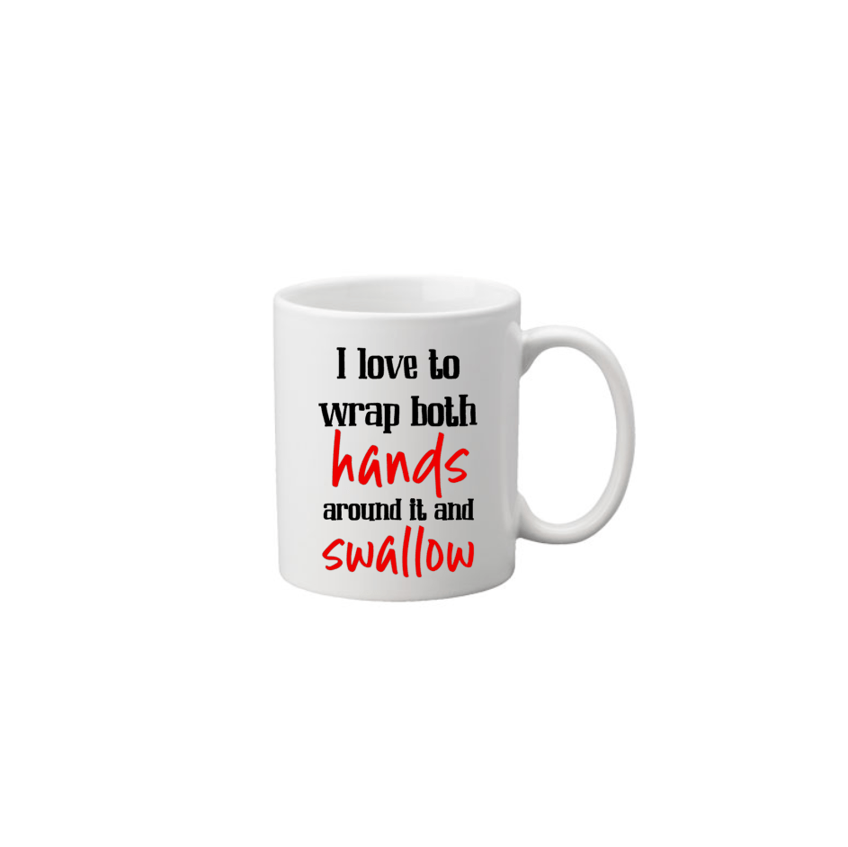 "I Love To Wrap My Hands Around It And Swallow" printed on a 15oz coffee cup. These premium coffee mugs feature a glossy surface with a beautiful full color image printed onto it. It features sturdy walls for safe, durable use. They are dishwasher safe, microwave safe and lead free.